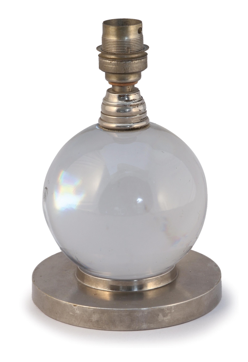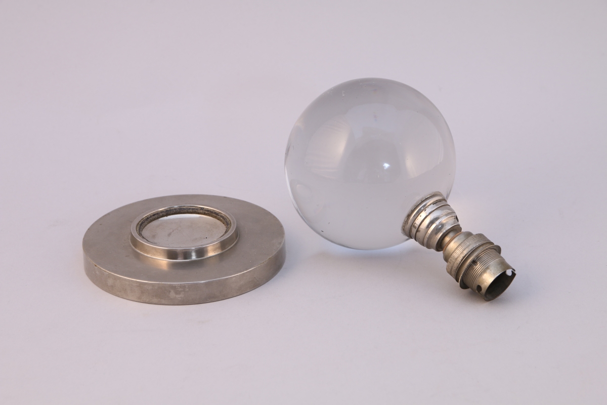 Boule de cristal transparent sur un socle circulaire en bronze nickelé. Bague en inox. Électrifiée.