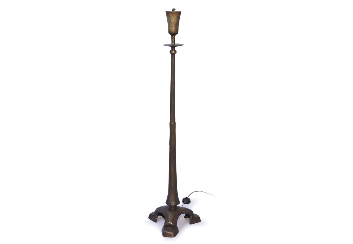 LAMPE de PARQUET en bronze patiné. Le fût fuselé est terminé par un disque soulignant une coupe tronconique; il repose sur trois pieds cambrés.