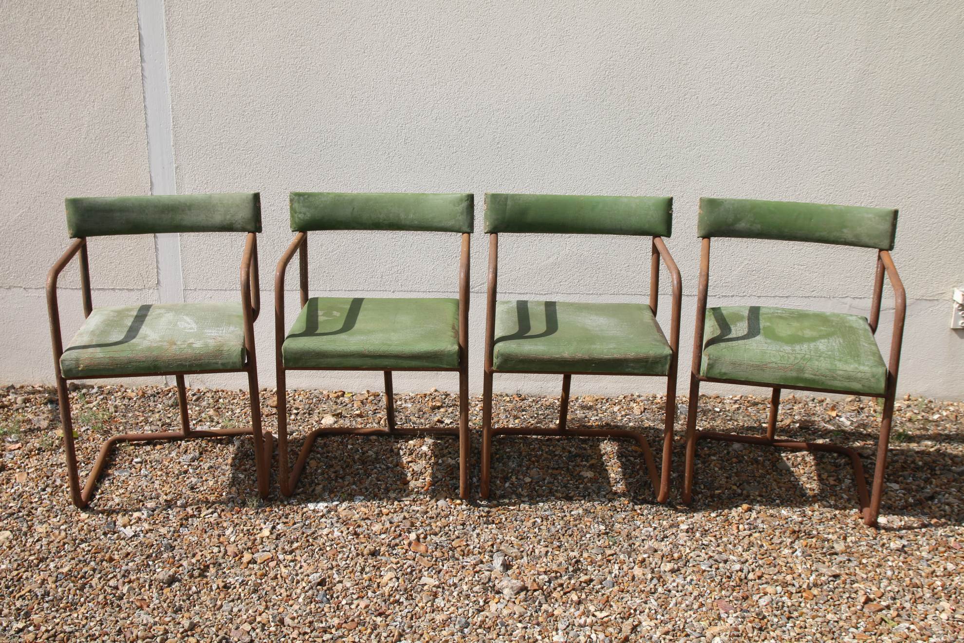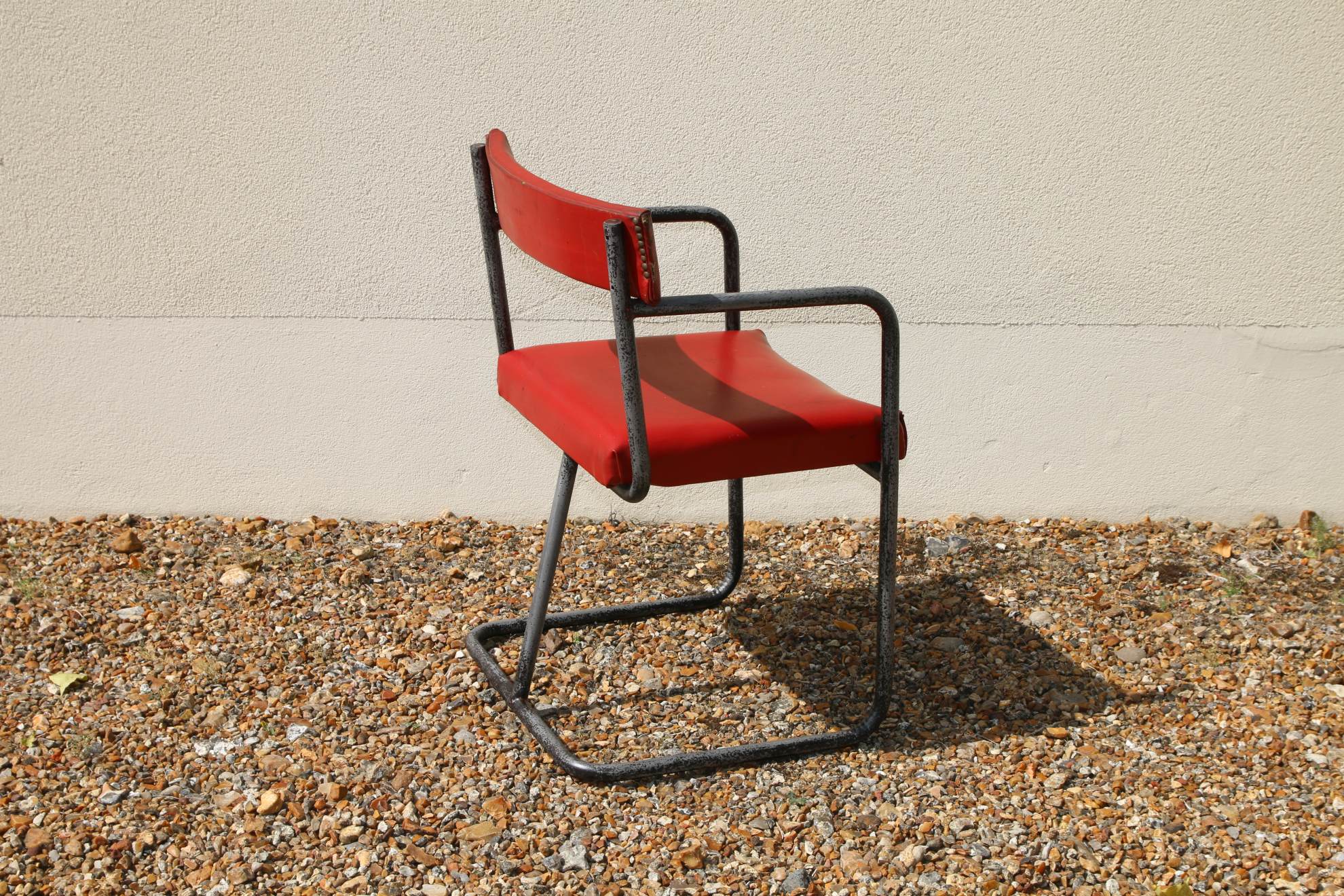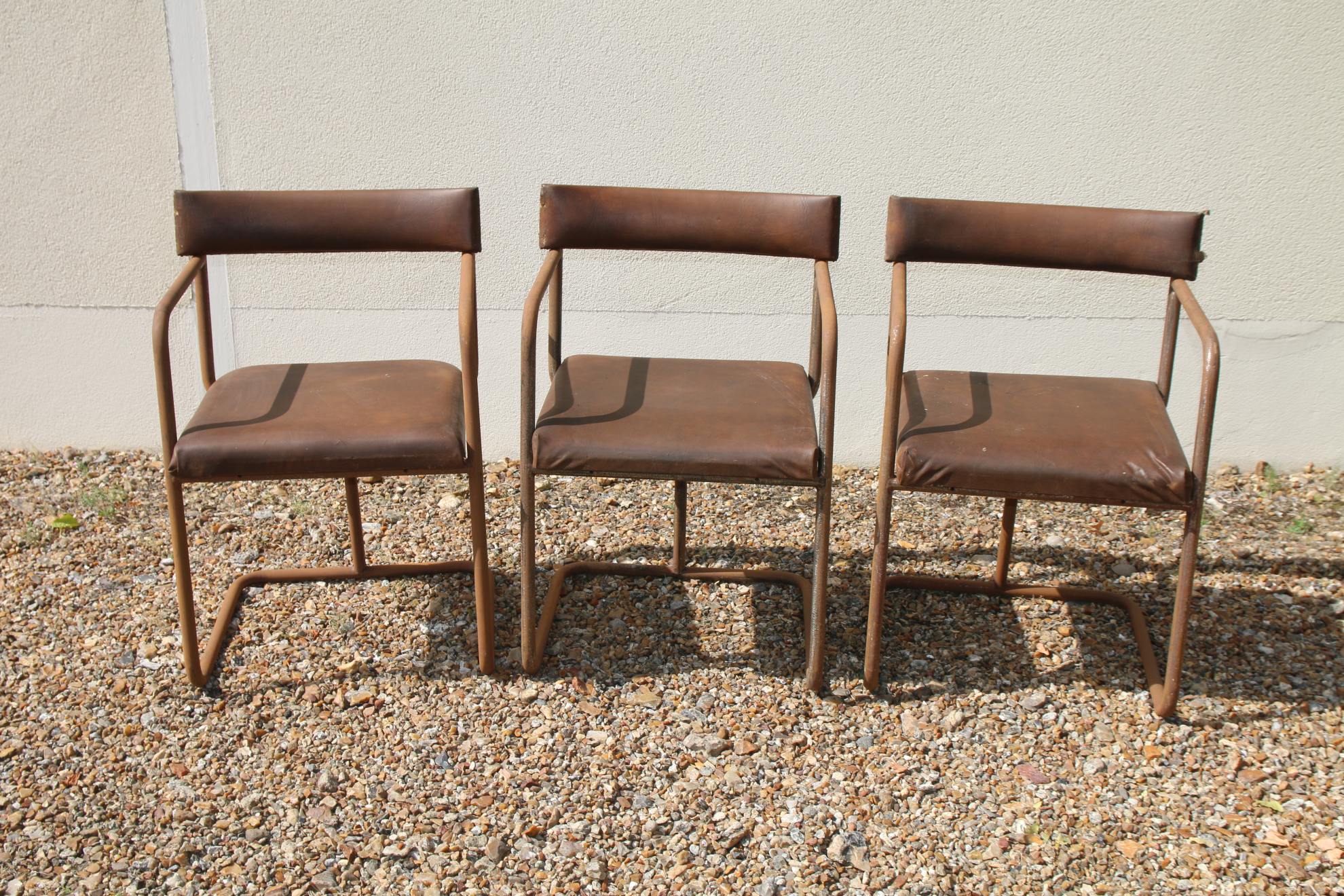 10 FAUTEUILS à structure métallique tubulaire. Recouverts de skaï rouge, vert, chocolat.