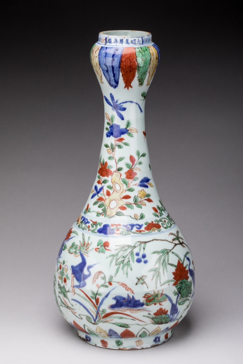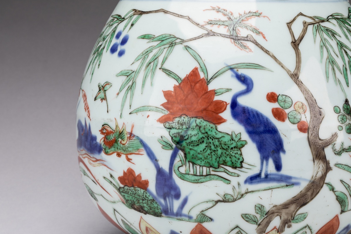 en porcelaine décorée en bleu sous couverte et émaux polychromes dit "wucai" de grues, papillons en vol, bambous et canards parmi les fleurs de lotus. Marque à six caractères de Wanli en bleu sous couverte sur le col.