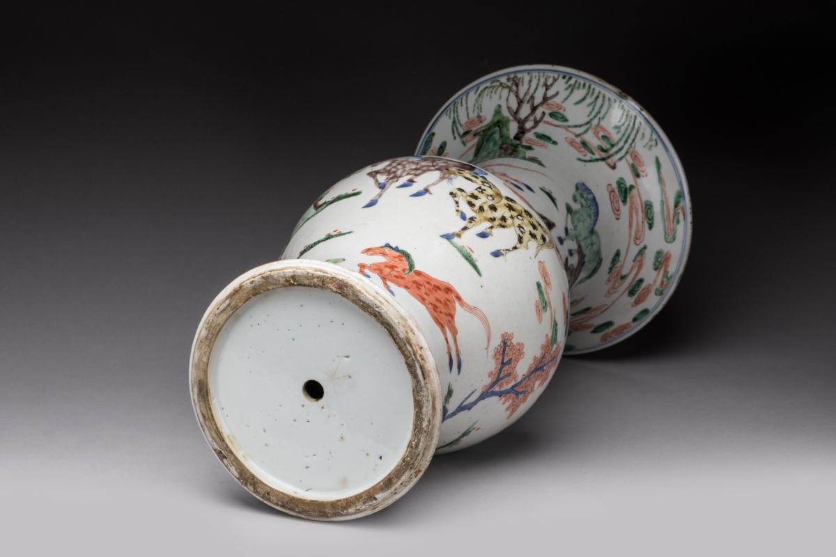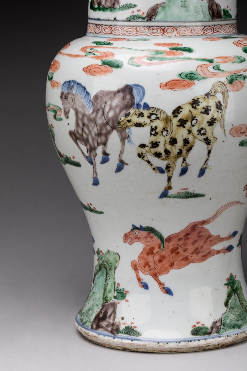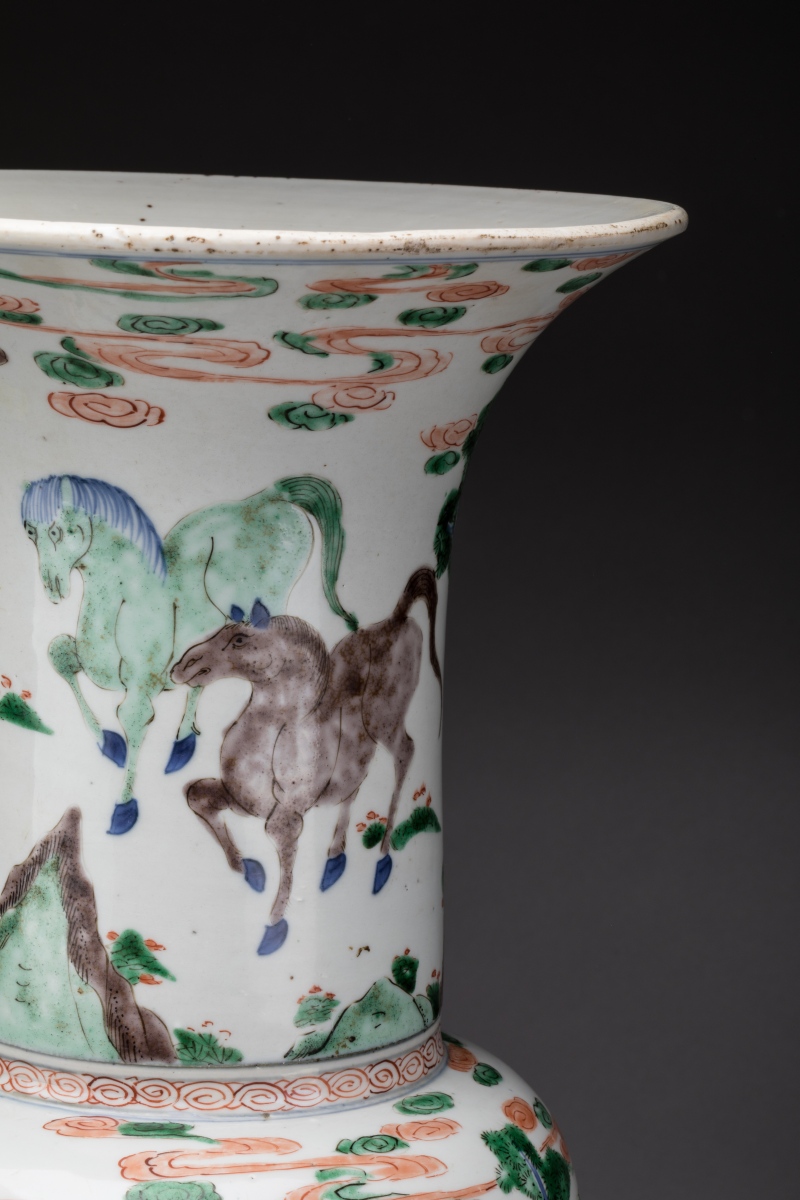 VASE de forme YANYAN en porcelaine à décor en émaux polychromes de la famille verte de huit chevaux galopant et paissant dans un paysage rocailleux et parmi les nuées.