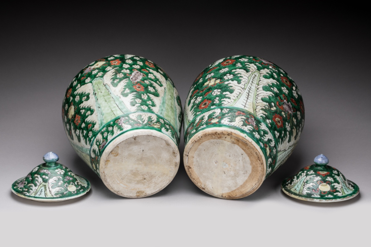 PAIRE DE POTICHES couvertes et balustres en porcelaine décorée en émaux verts, rouges et jaunes d'objets de bonne augure, fleurs de cerisiers sur fond de vagues.