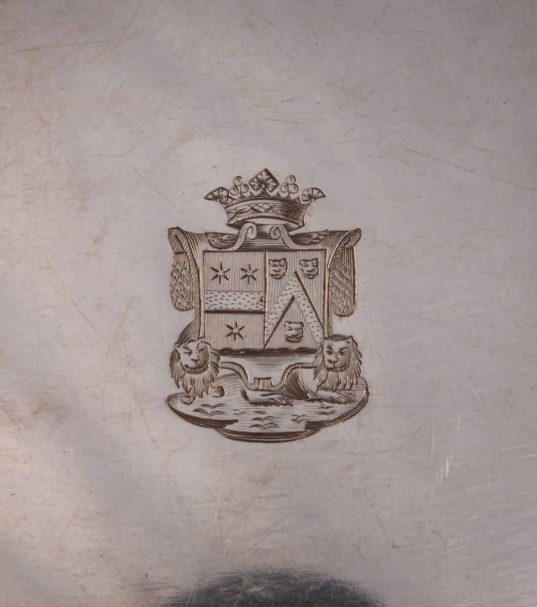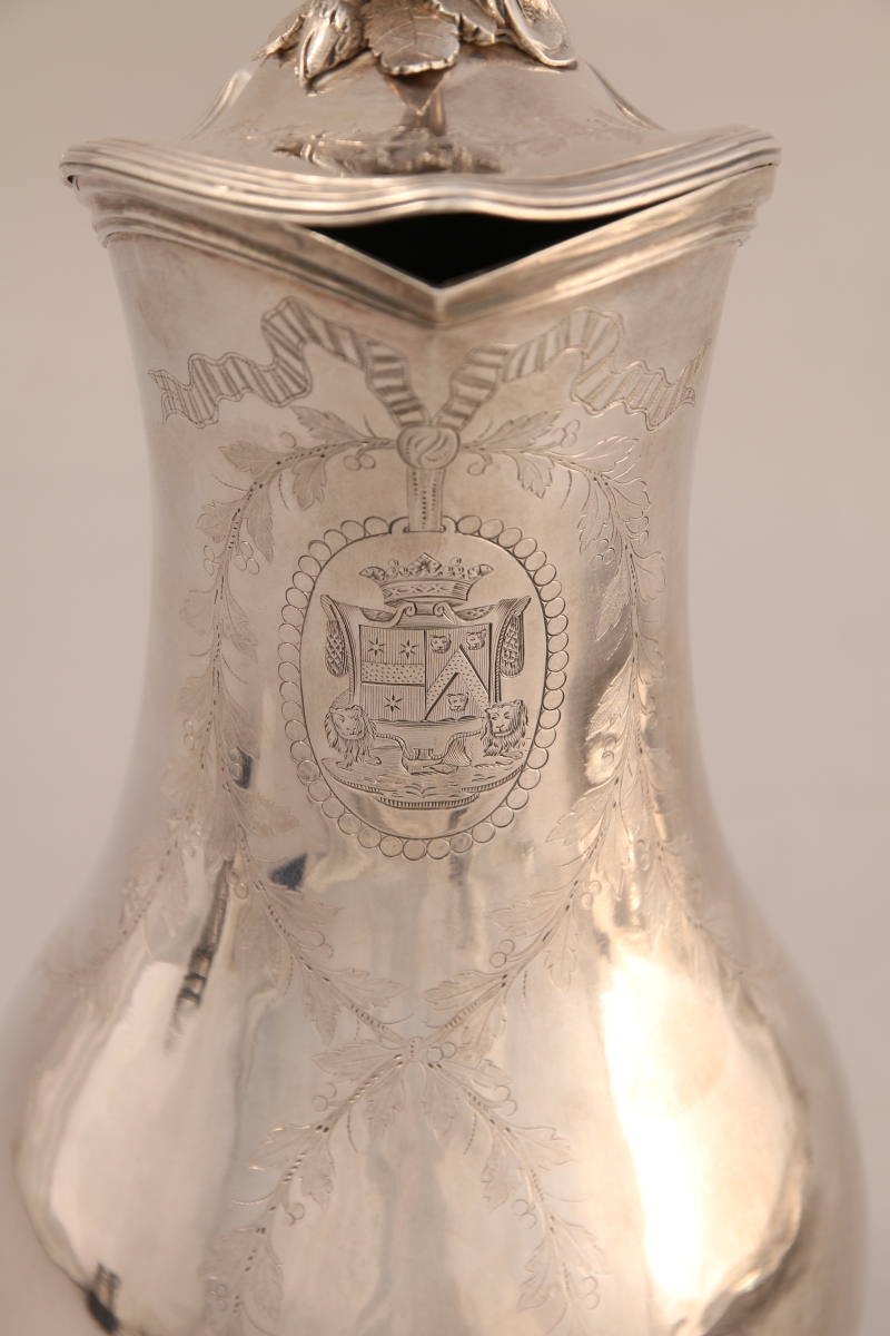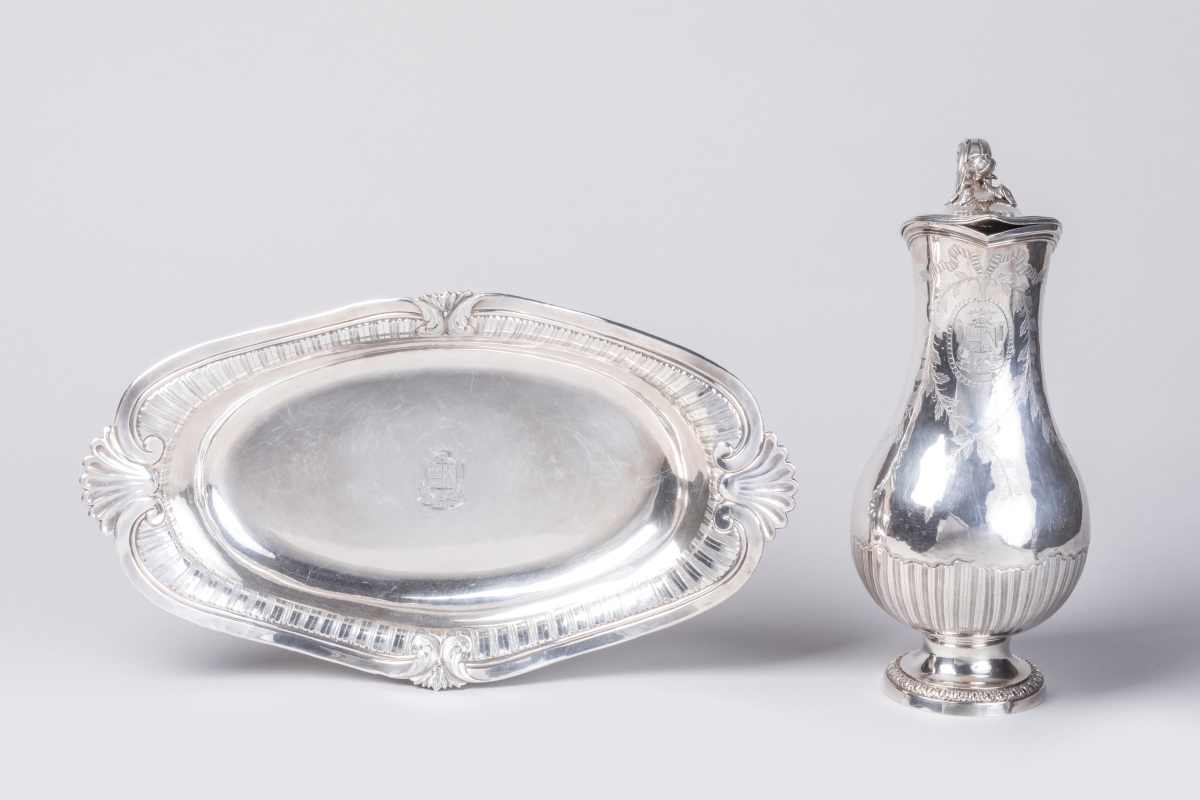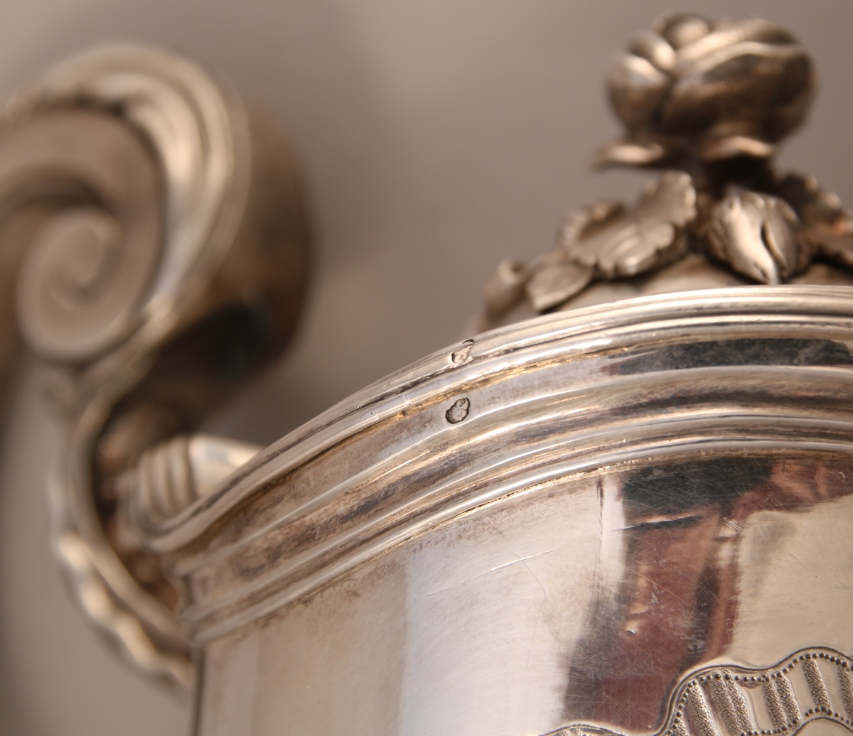 en argent sur piédouche à moulures de graines d'oves et de vagues ciselées et guillochées en alternance, sous le bec, guirlandes de branches de laurier avec armes d'alliance timbrées d'une couronne de marquis. Anse à feuillages, prise de couvercle en branche de rosier. Le bassin ovale contourné à décor de coquilles en agrafes et armorié de même.