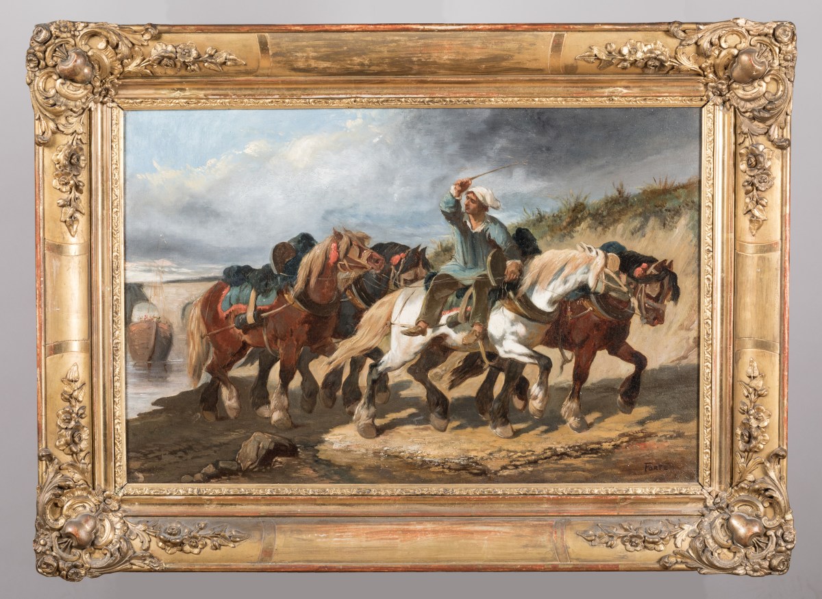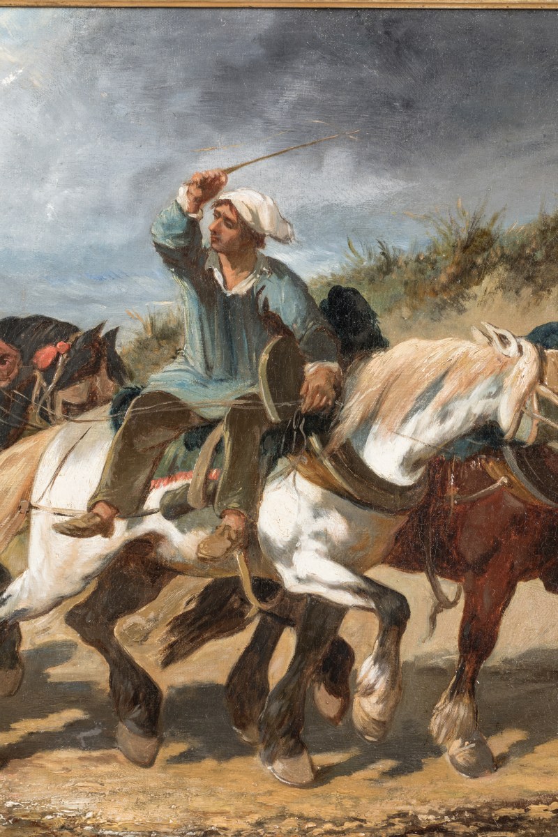 Débutant au salon de 1842, Théodore Fort se spécialise dans les sujets militaires où le cheval joue un rôle essentiel (Benezit). Aquarelliste de talent, il montre avec cette paire d'huiles sa maîtrise de la technique et des sujets, représentant le même groupe de chevaux au travail, sur un chemin de halage (ou au gué ?) puis à l'écurie. Les cieux tourmentés du paysage contrastent avec l'éclairage à la bougie de la scène d'intérieur, montrant l'attachement du peintre aux leçons romantiques d'un Géricault, dont un groupe de chevaux à l'écurie -une composition proche de la nôtre- s'est vendue en juin 2016 au château d'Artigny.