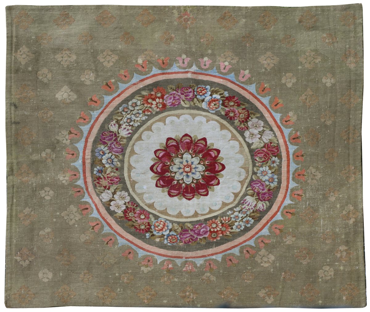 A green background AUBUSSON CARPET with a central medaillon adorned with a rosette and a garland of flowers. 19th century.