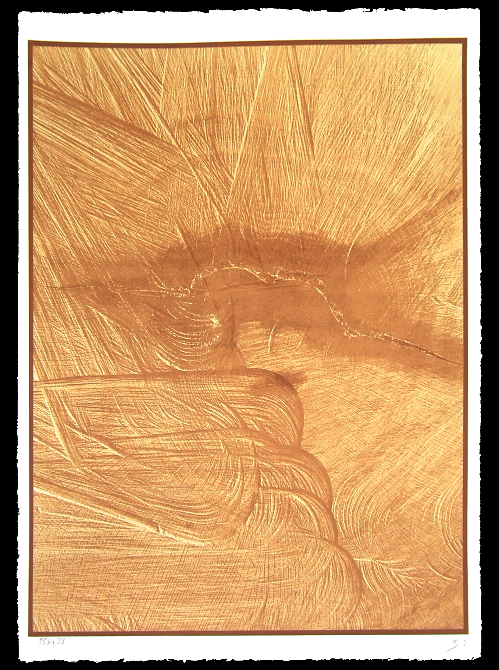 Sérigraphie numérotée, tirée de la série de cyanotypes ( procédé photographique ancien ) et réalisée dans l'atelier d'art du sérigraphe Jean-François Chandellier. Image solaire d'une coupe de bois dont on distingue le rayonnement provoqué par la lame de la tronçonneuse. A l'origine, l'image est bleu de Prusse d'où le terme de cyanotypie.