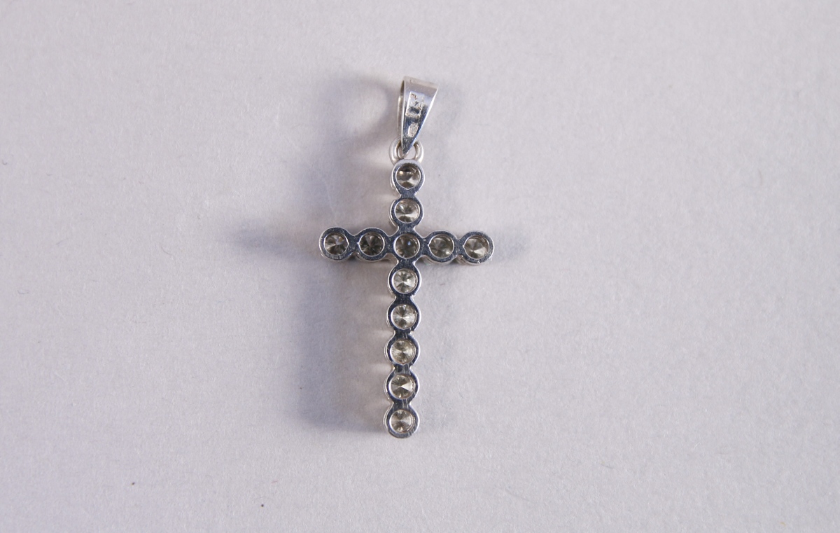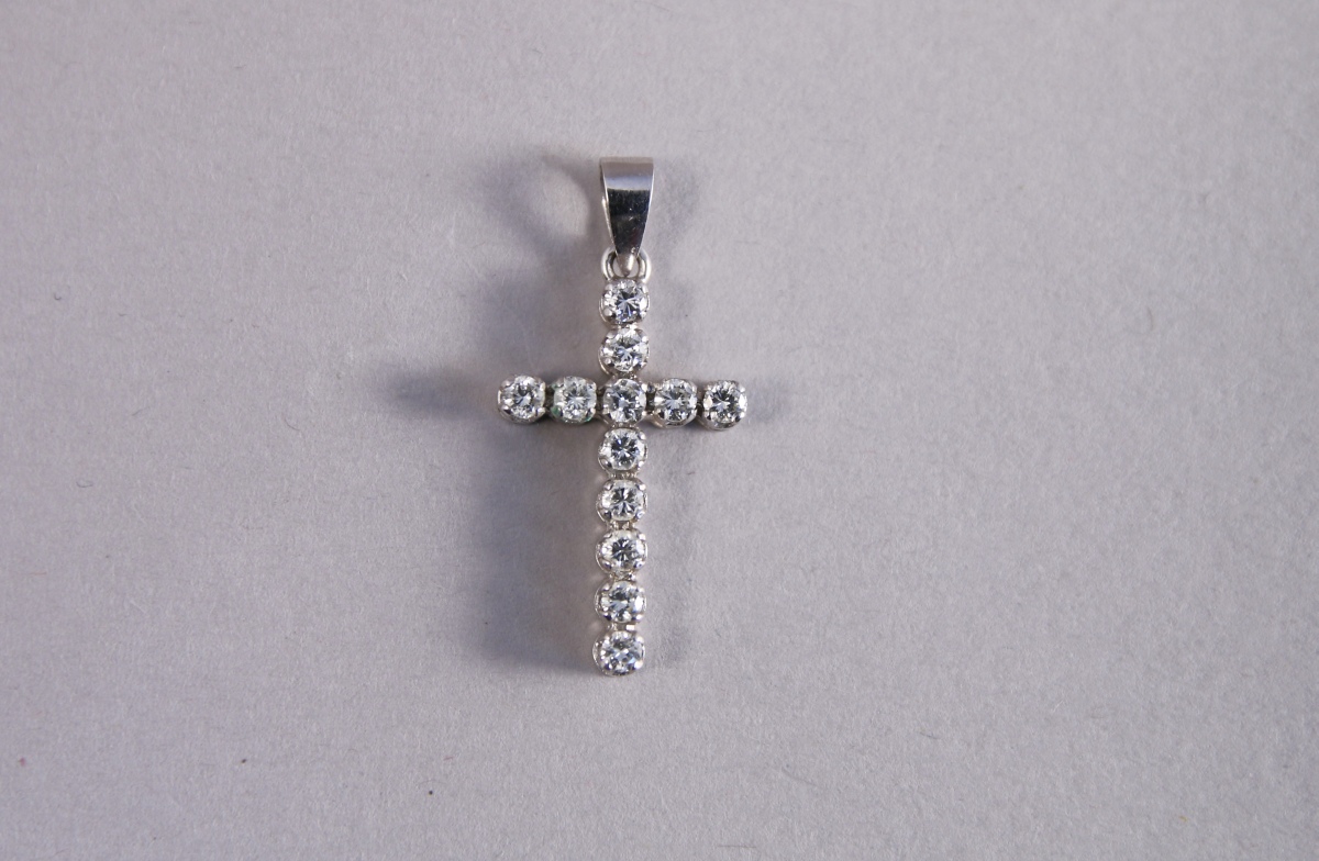 CROIX LATINE, PENDENTIF en or blanc serti de 12 pierres blanches.