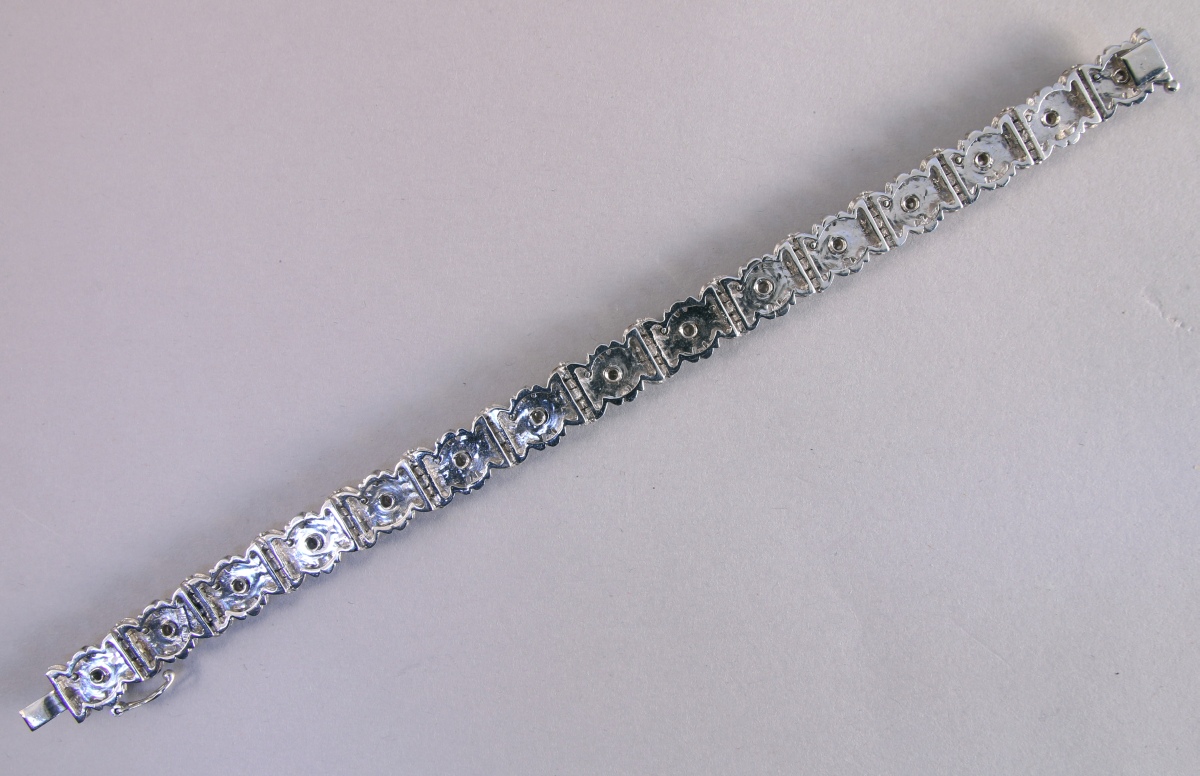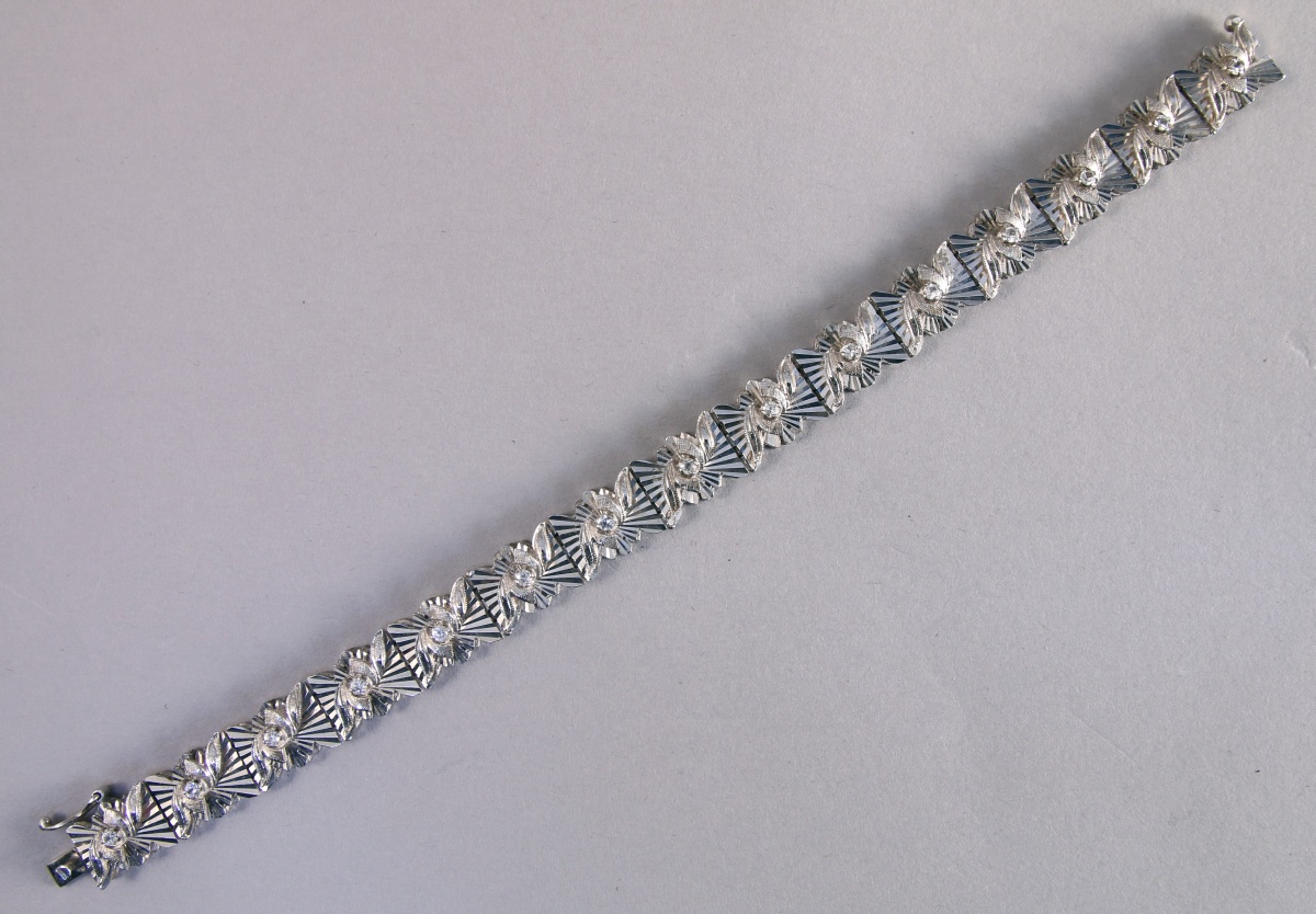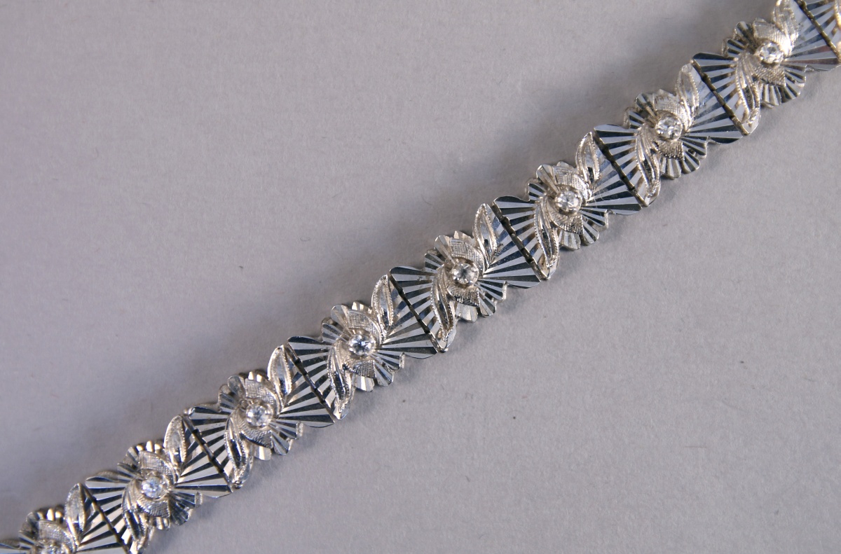 BRACELET en or gris 18K à maillons articulés de forme oblongue à motif rayonnant faceté. Chacun appliqué d'éléments feuillagés centrés d'une petite pierre blanche.