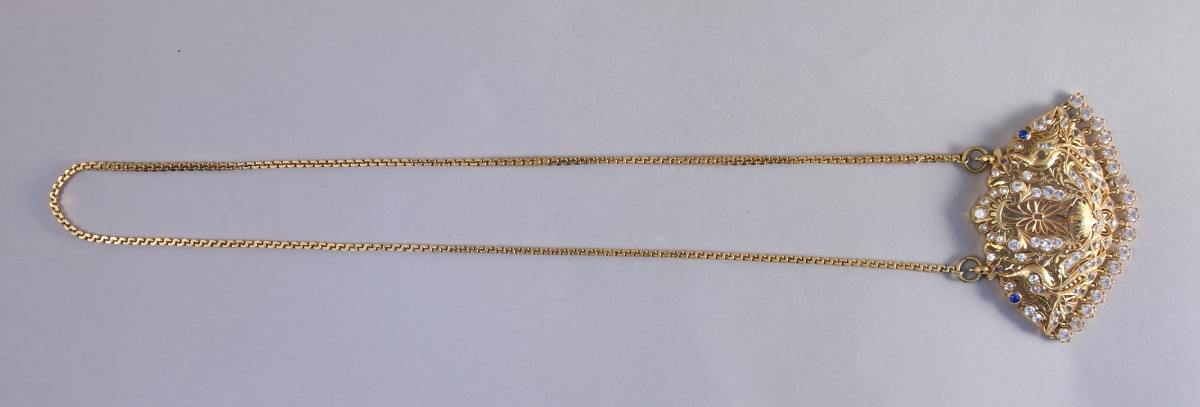 COLLIER en or jaune retenant un important pendentif pectoral de forme oblongue serti de pierres blanches et bleues à décor ajouré de deux oiseaux dans des motifs feuillagés. Une niche souligné d'une fleur de lotus au centre. Chaîne maille vénitienne. Travail étranger.