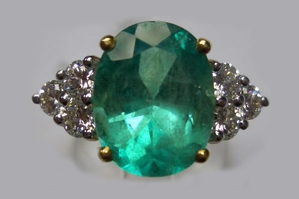 BAGUE en or jaune, ornée d'une ÉMERAUDE (probablement de Colombie) taille ovale d'environ 5,15 carats, épaulée de 2 X 3 DIAMANTS blancs taille moderne d'environ 0,85 carat .