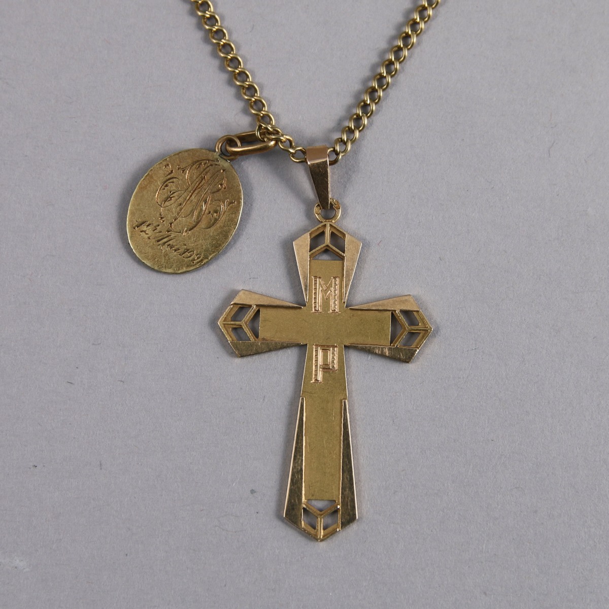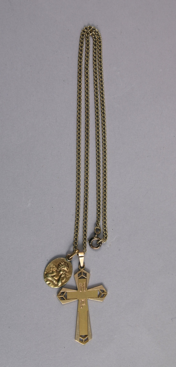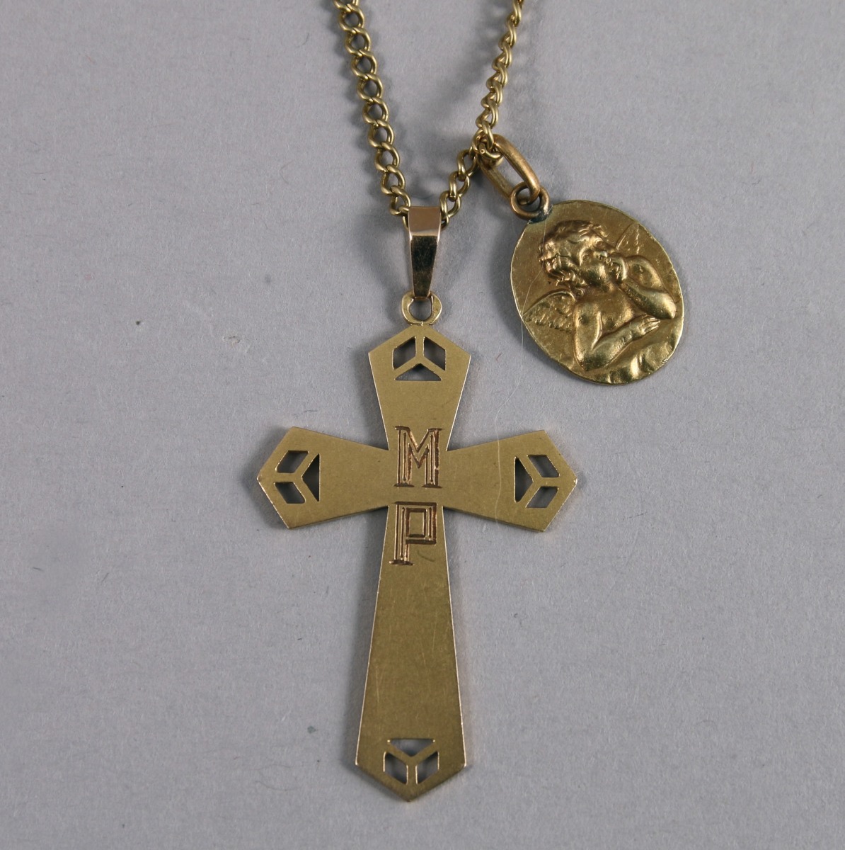 MÉDAILLE au CHÉRUBIN, CROIX monogrammée MP et CHAÎNE d'ENFANT en or jaune 18K.
