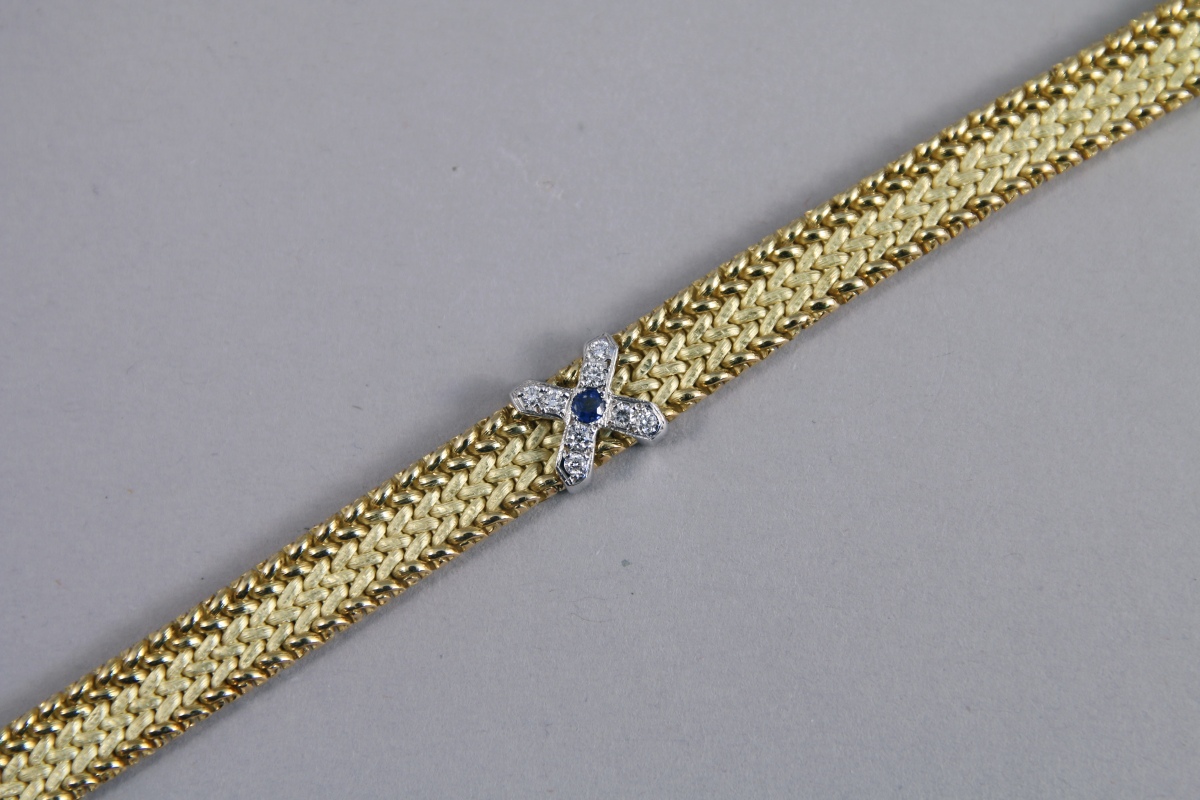 PARURE en or jaune 18K à mailles tressées comprenant un COLLIER orné de trois motifs en croix avec des SAPHIRS et des DIAMANTS et une BAGUE.