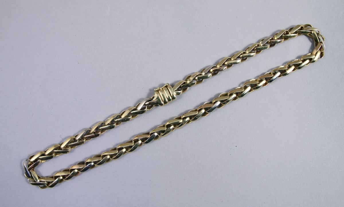 COLLIER à maille articulée trois ors : jaune, gris et rose 18K. Travail étranger.