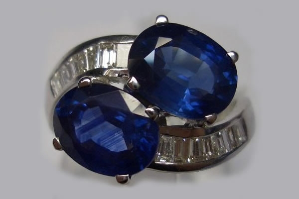 BAGUE TOI et MOI en or blanc, sertie de deux SAPHIRS taille ovale d'environ 2,45 carats et 2,35 carats agrémentés de 14 DIAMANTS blancs taille baguette d'environ 0,40 carat.