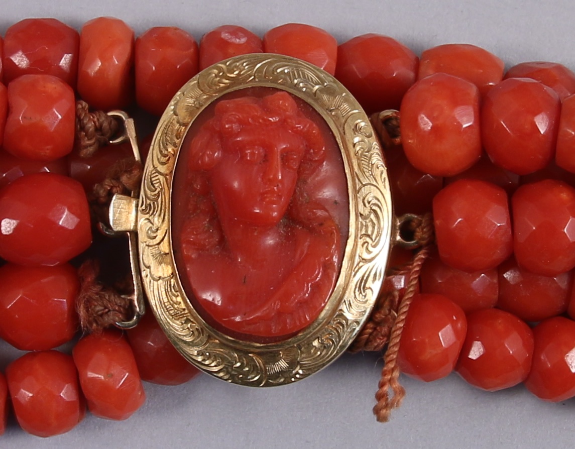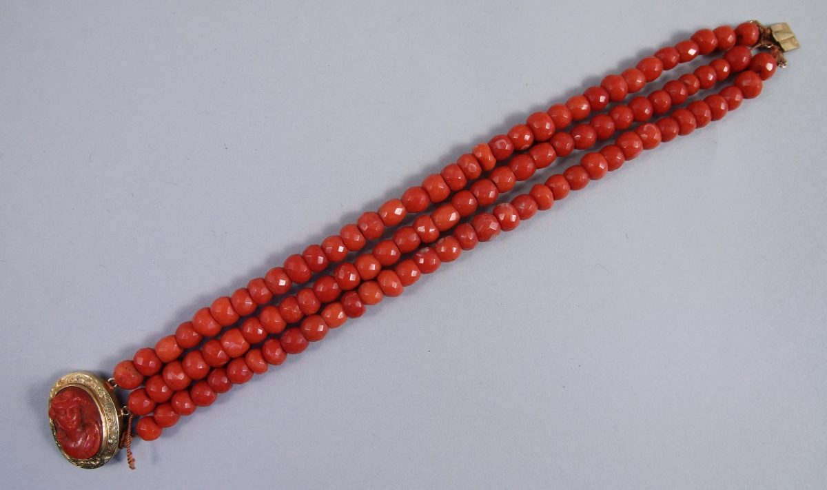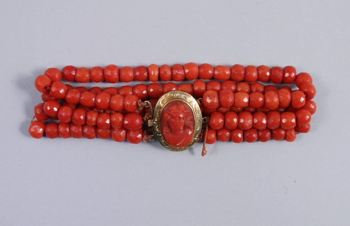 BRACELET à trois rangs de perles de corail facettées. Fermoir en or jaune 18K orné d'un camée corail figurant une jeune femme en buste.