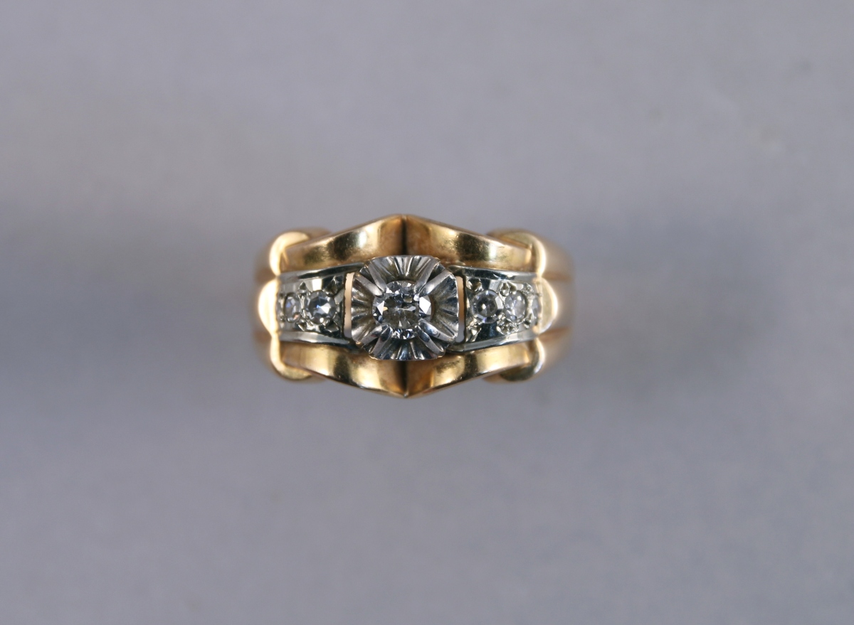BAGUE TANK en or jaune 18K orné d'un DIAMANT dans un entourage de six petits DIAMANTS en ligne.