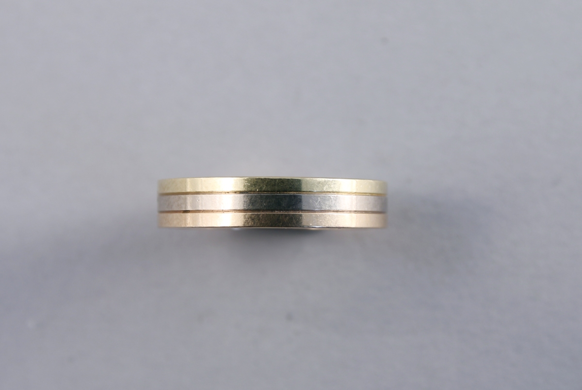 CARTIER. ALLIANCE "TRINITY" en or jaune, gris et rose 18K. Signée et numérotée "XB5622/62". Accompagnée de son certificat.