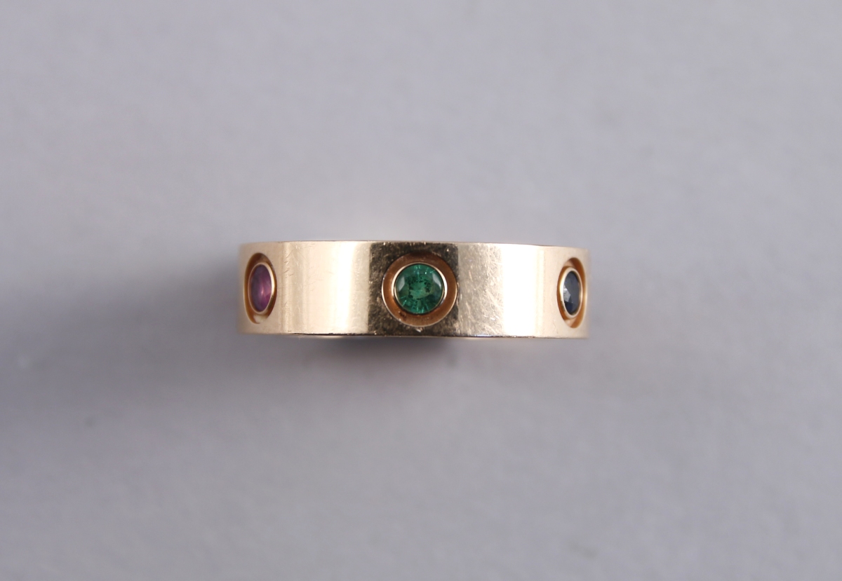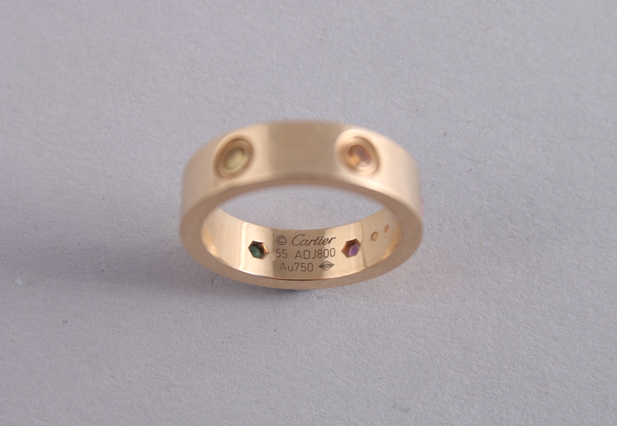 CARTIER. BAGUE "LOVE" en or rose 18K sertie de six pierres de couleur : un saphir rose, un saphir bleu, un saphir jaune, un grenat vert, un grenat orange et une améthyste. Signée et numérotée "ADJ800/55". Accompagnée de son certificat.