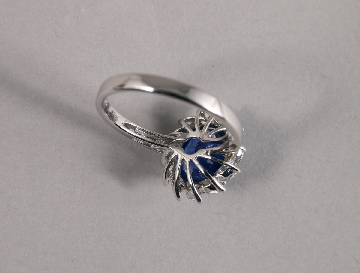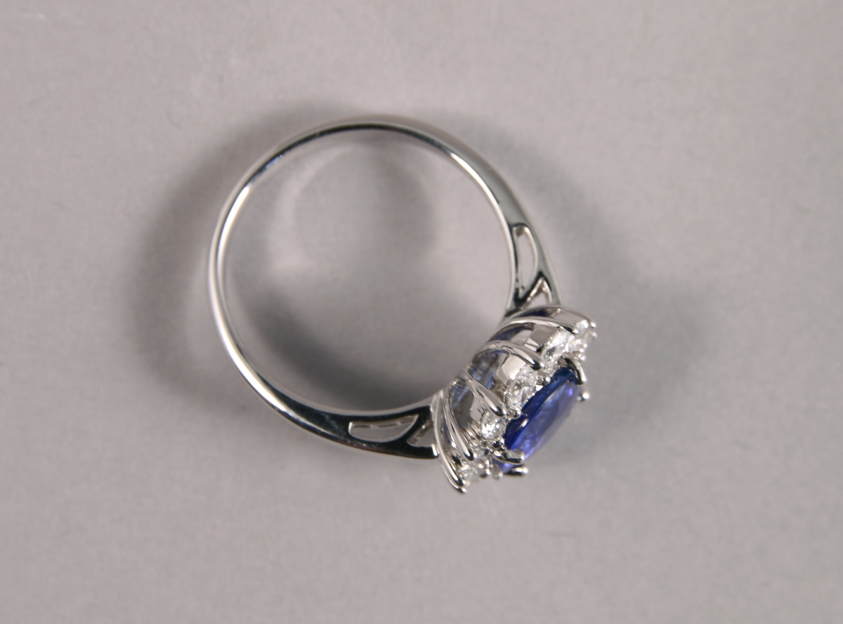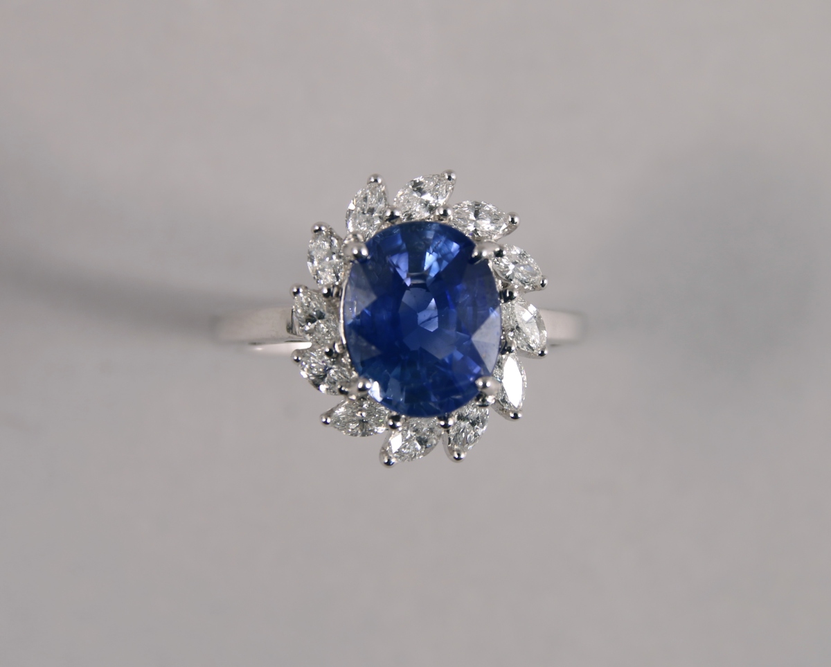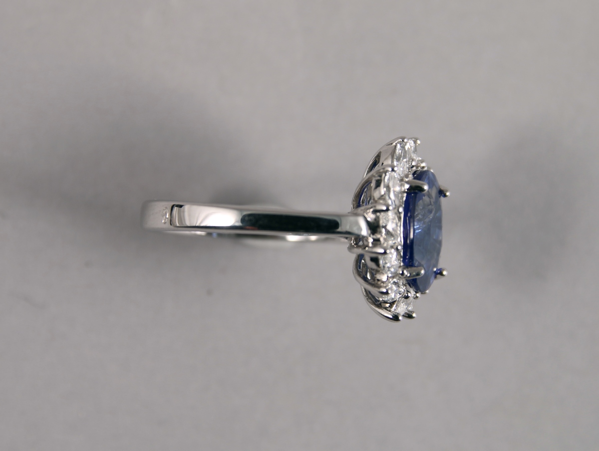 BAGUE ovale en or blanc, ornée en son centre d'un SAPHIR taille ovale d'environ 3,48 carats dans un entourage de 12 DIAMANTS blancs taille navette d'environ 0,60 carat.