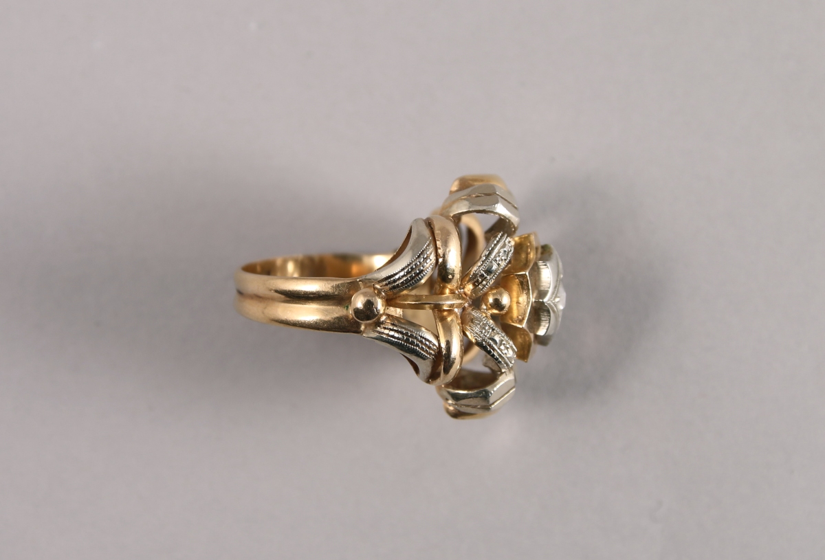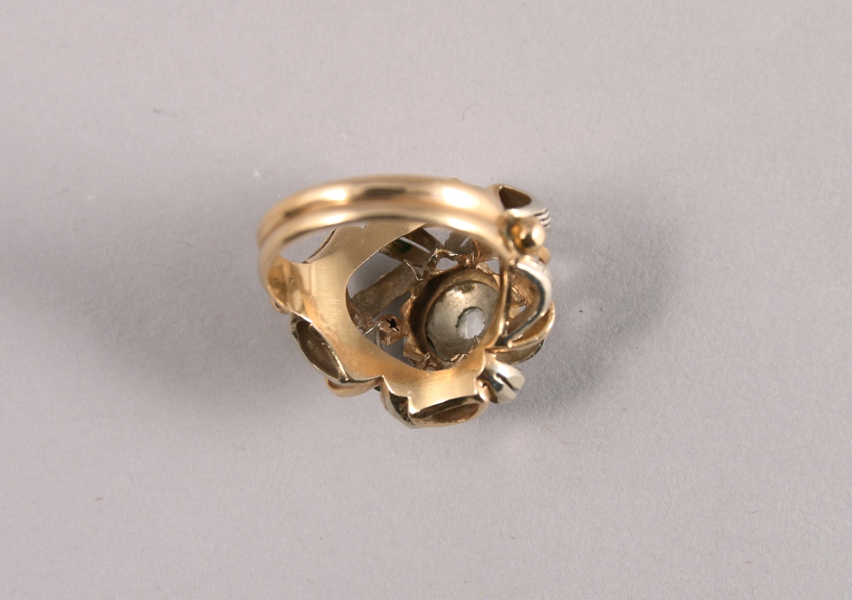 BAGUE en or jaune et gris 18K. Important chaton ajouré de motifs arqués centré d'un DIAMANT taille rose.