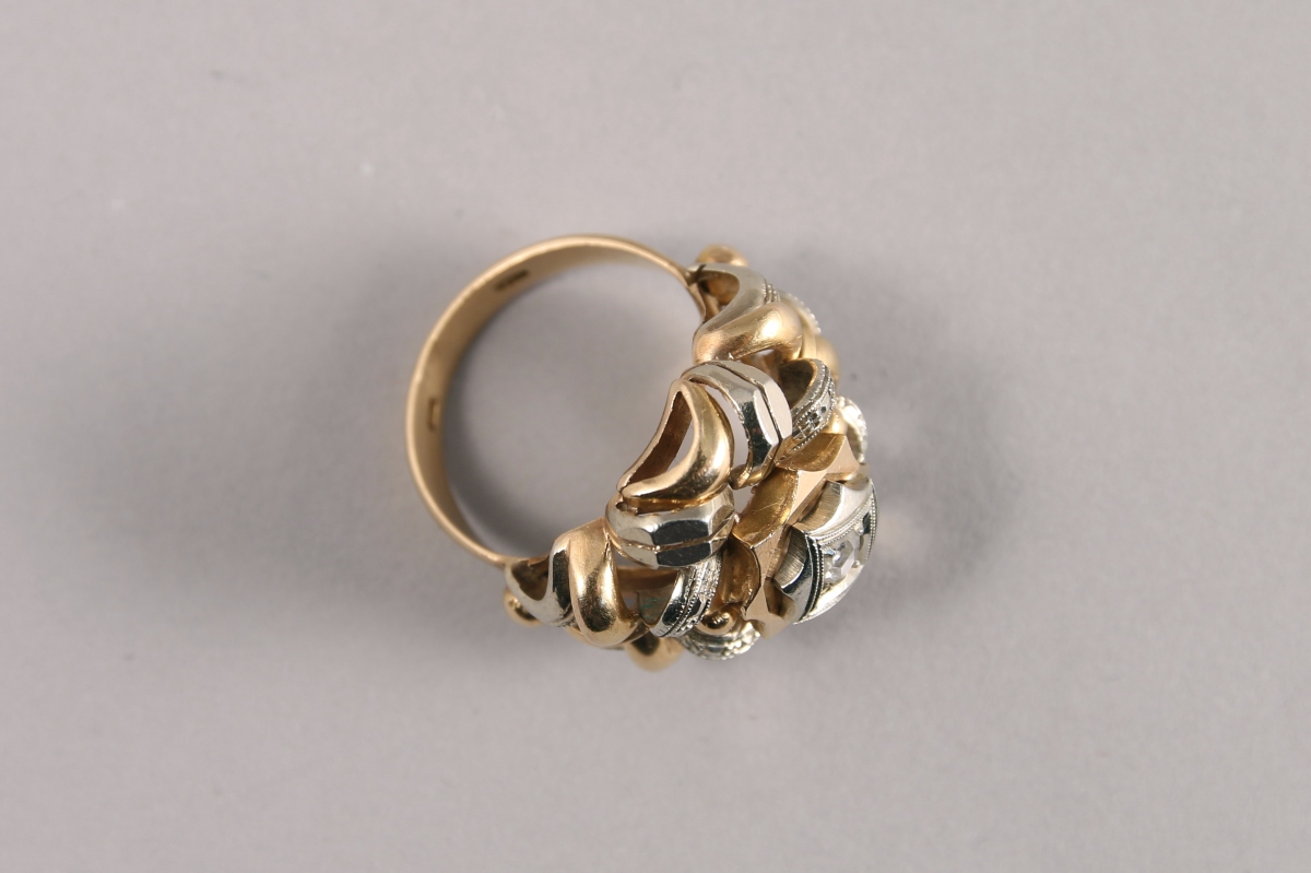 BAGUE en or jaune et gris 18K. Important chaton ajouré...