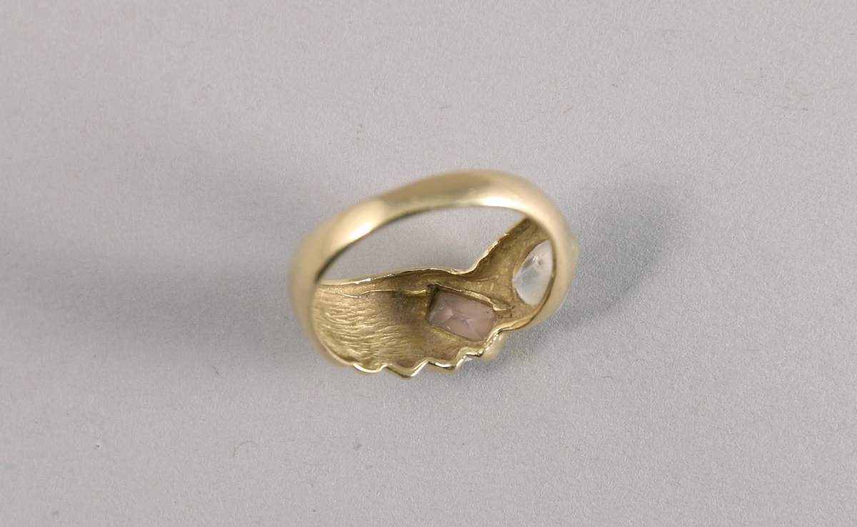 BAGUE en or jaune 18K ornée de godrons. Elle est sertie d'un pierre rose taille émeraude et d'une pierre blanche taille poire.