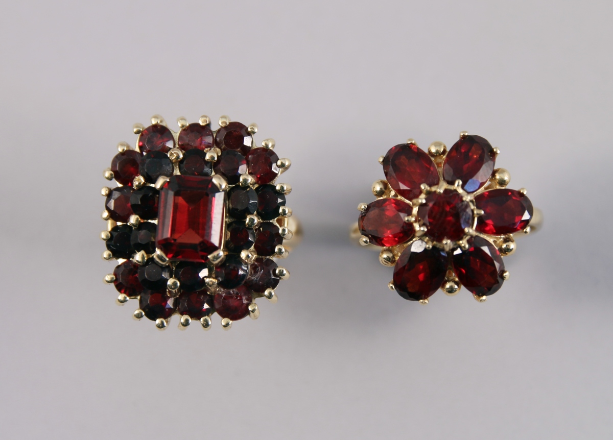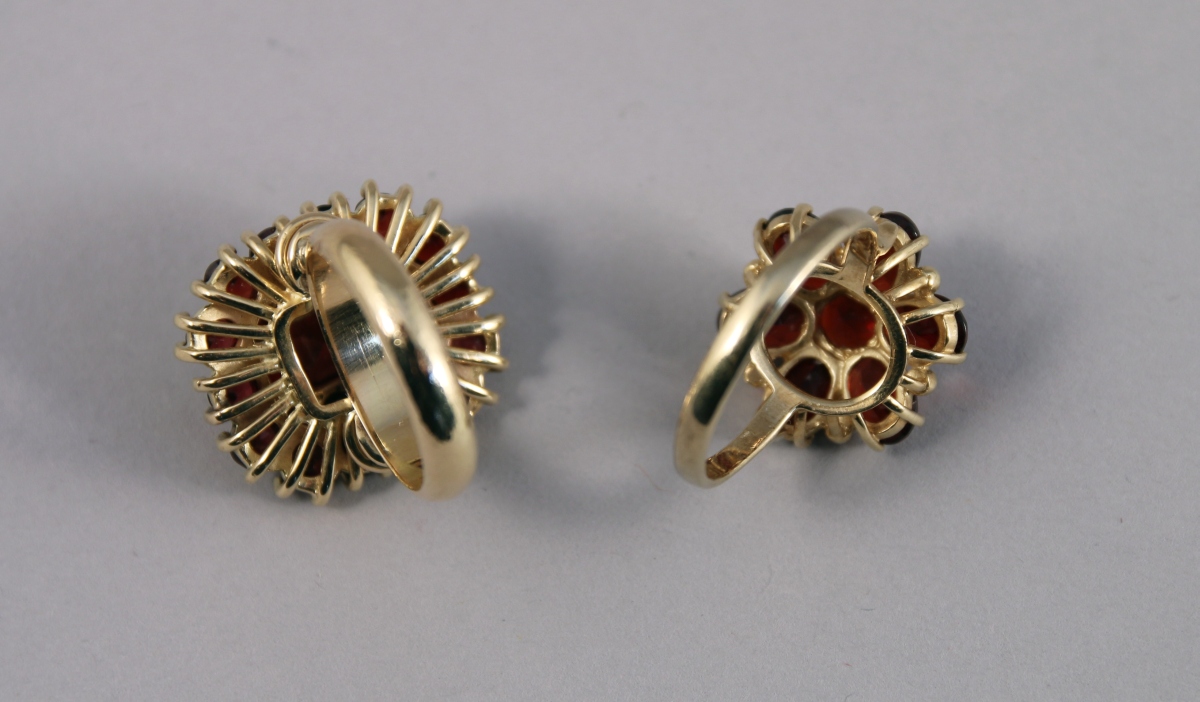 - BAGUE dite MARGUERITE centrée d'un grenat taille ronde dans un entourage de six grenats taille navette. TDD : 60,5. Poids brut : 6,5 g.