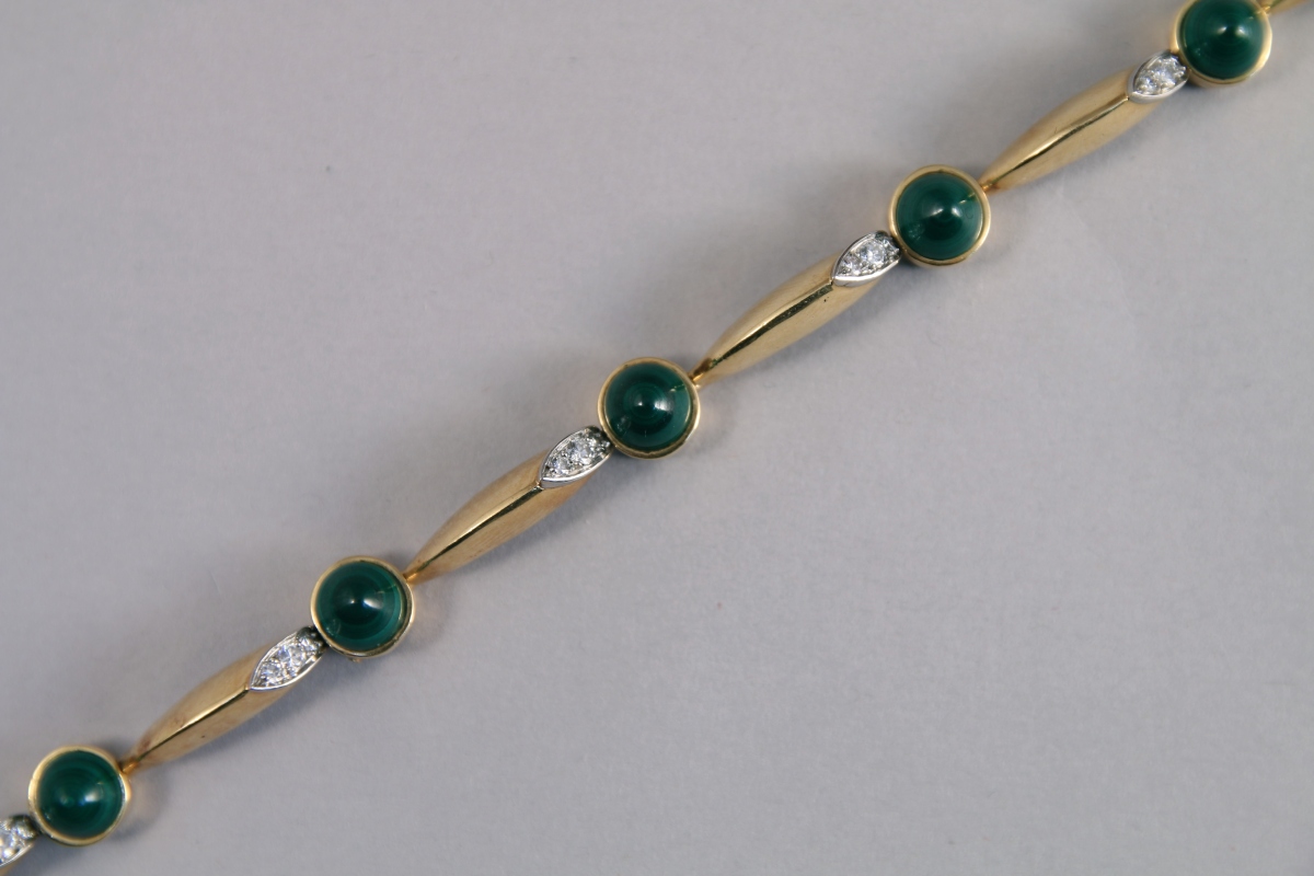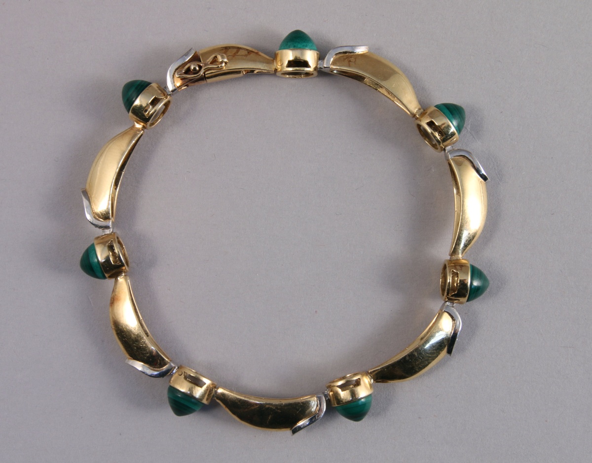 PIAGET. BRACELET articulé en or jaune 18K. Il est orné de sept cabochons de MALACHITE et de 21 petits DIAMANTS. Signé.