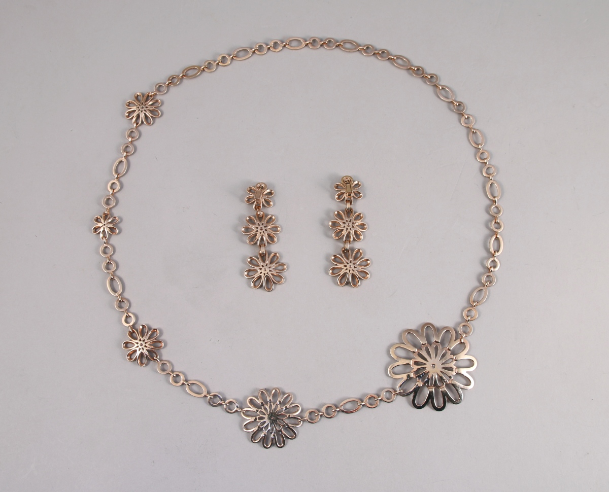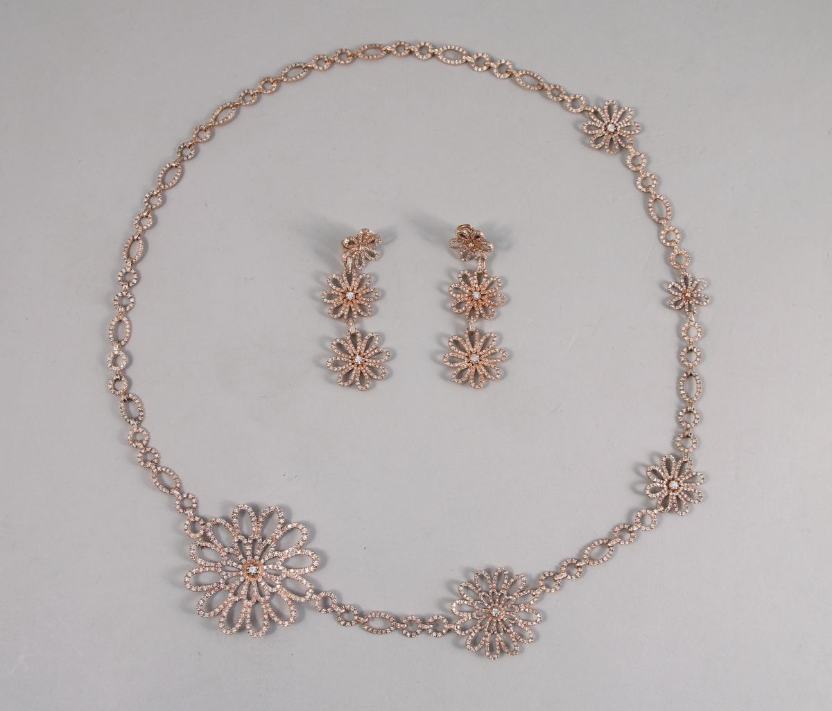 PARURE en or rose 18K composée d'un SAUTOIR et d'une paire de BOUCLES D'OREILLES entièrement sertis de petits DIAMANTS. Le sautoir est composé de maillons de forme ronde et ovale en alternance avec des fleurs stylisées ajourées de différente taille. Les boucles d'oreille ornées de trois fleurs similaires en chute.