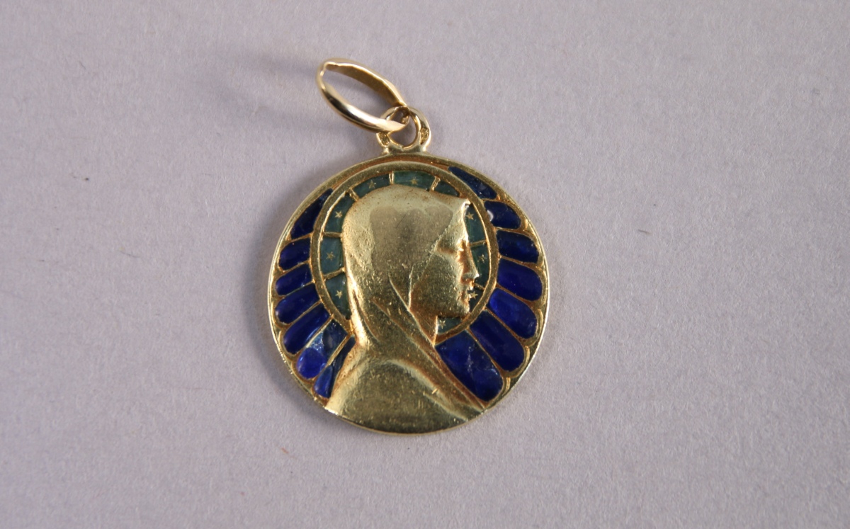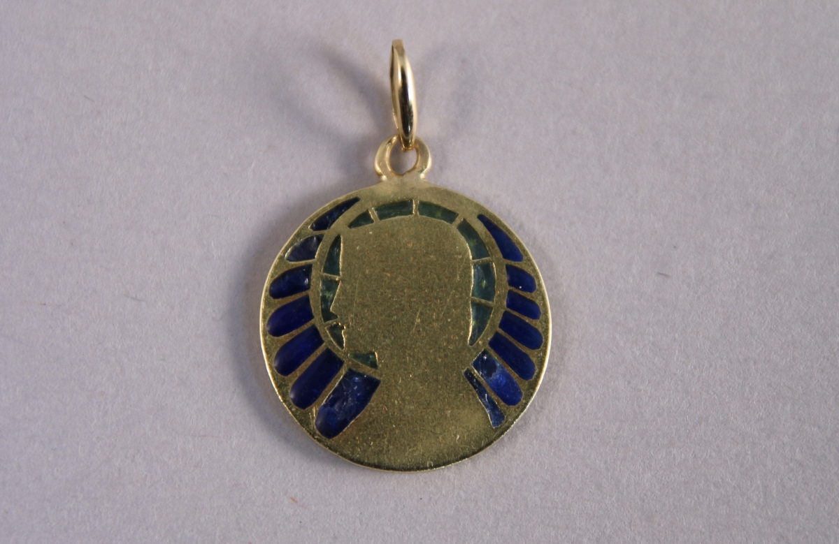 MÉDAILLE en or jaune 18K figurant la sainte Vierge de profil dans un encadrement en émail "plique-à-jour" bleu à l'imitation du vitrail. Poinçon tête d'aigle. Vierge.