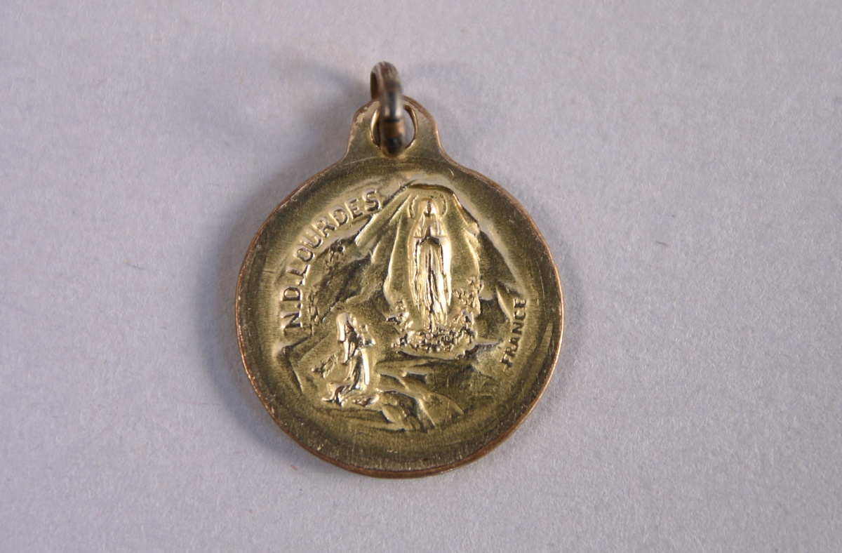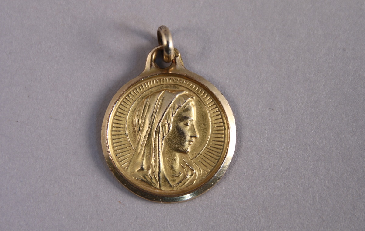 JOINT : MÉDAILLE en métal doré figurant la sainte Vierge de profil.