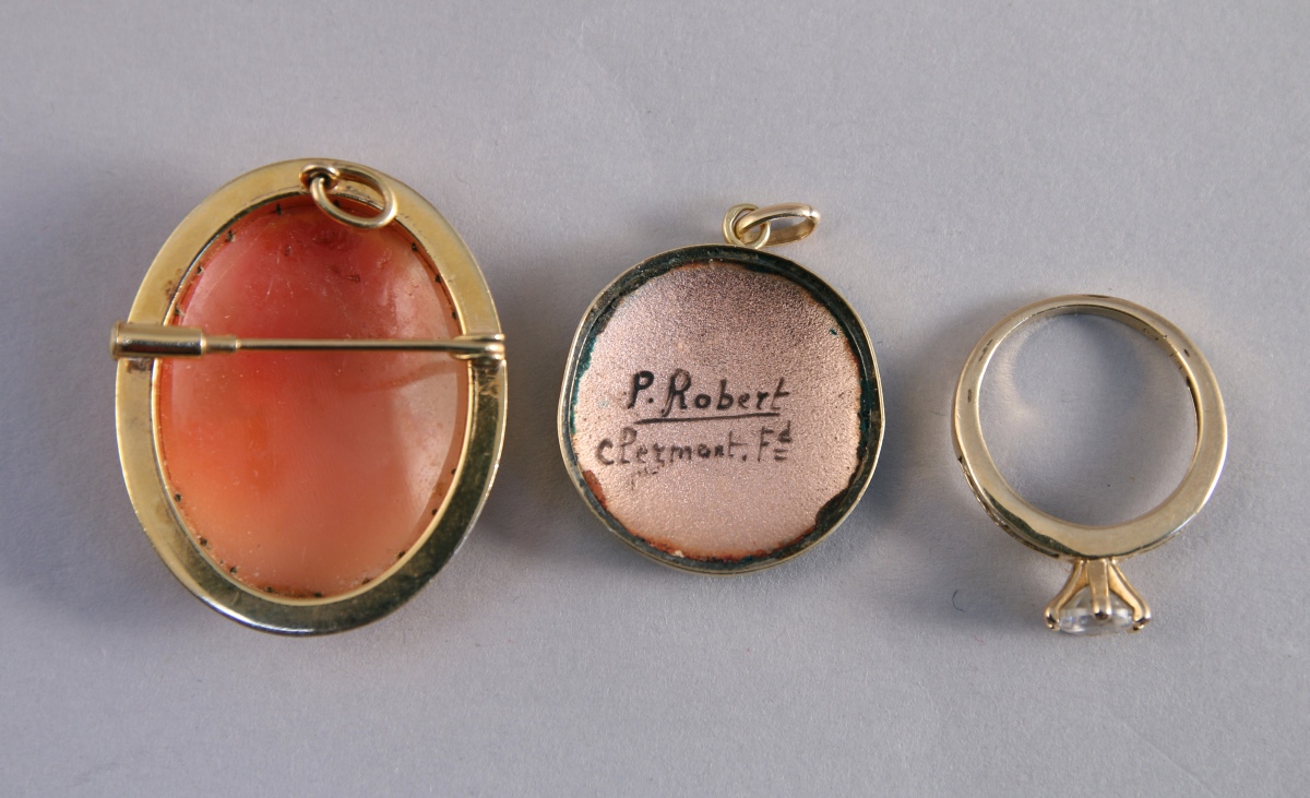 MÉDAILLON de forme ronde en cuivre émaillé cerclé d'or jaune 18K. Il figure une dame de profil. Signé "P. Robert / Clermont. Fd".