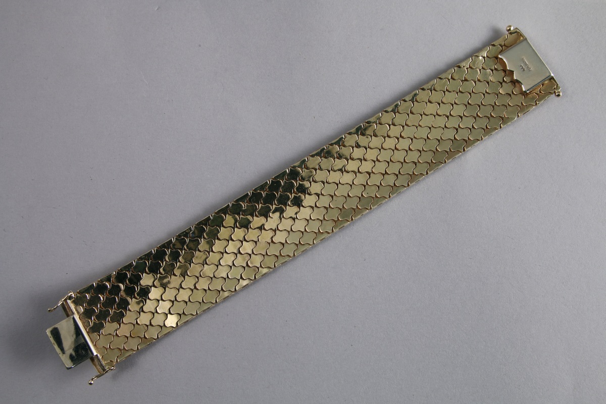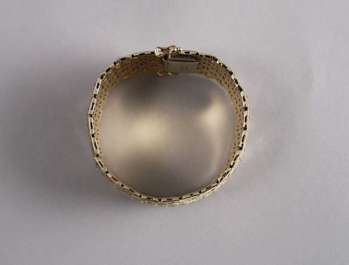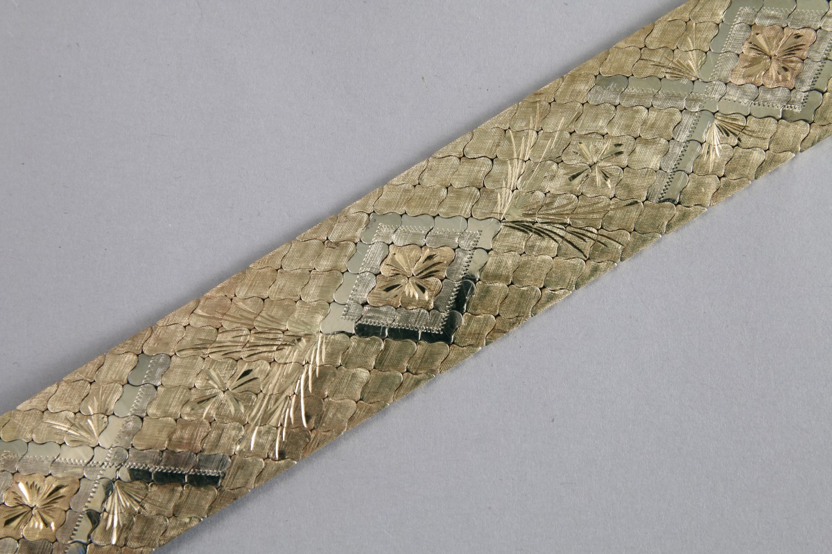 BRACELET MANCHETTE, maille écaille, en or 18K. Sur fond en or jaune amati, il est orné de trois motifs de forme losangique en or gris centrés d'un fleuron en or rose. Il est en outre gravé de gerbes stylisés.