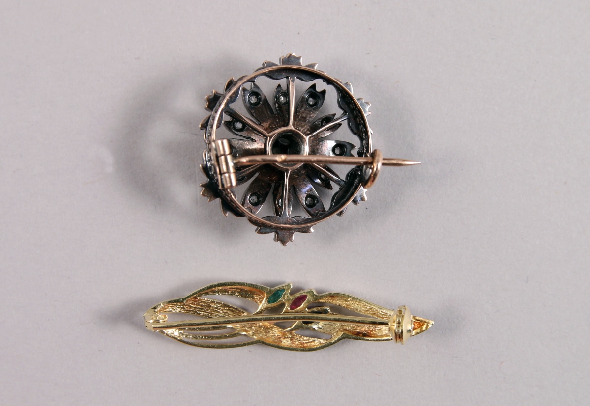 JOINT : BROCHE de forme ronde à bords chantournés en or 18K et argent. Elle figure un fleuron orné de petits brillants. Diam. 2,4 cm. Poids brut : 6,9 g.
