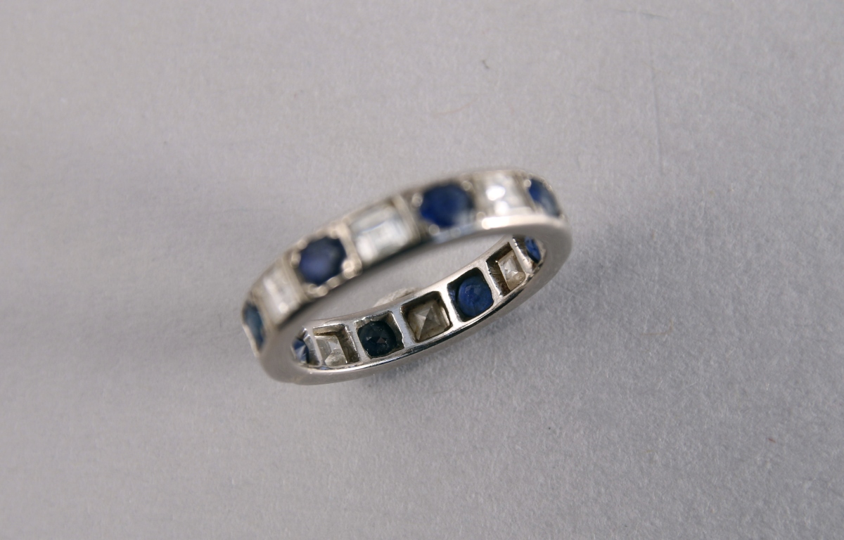 ALLIANCE AMÉRICAINE en or blanc ou platine sertie de huit DIAMANTS taille émeraude en alternance avec huit SAPHIRES taille ovale (usures).