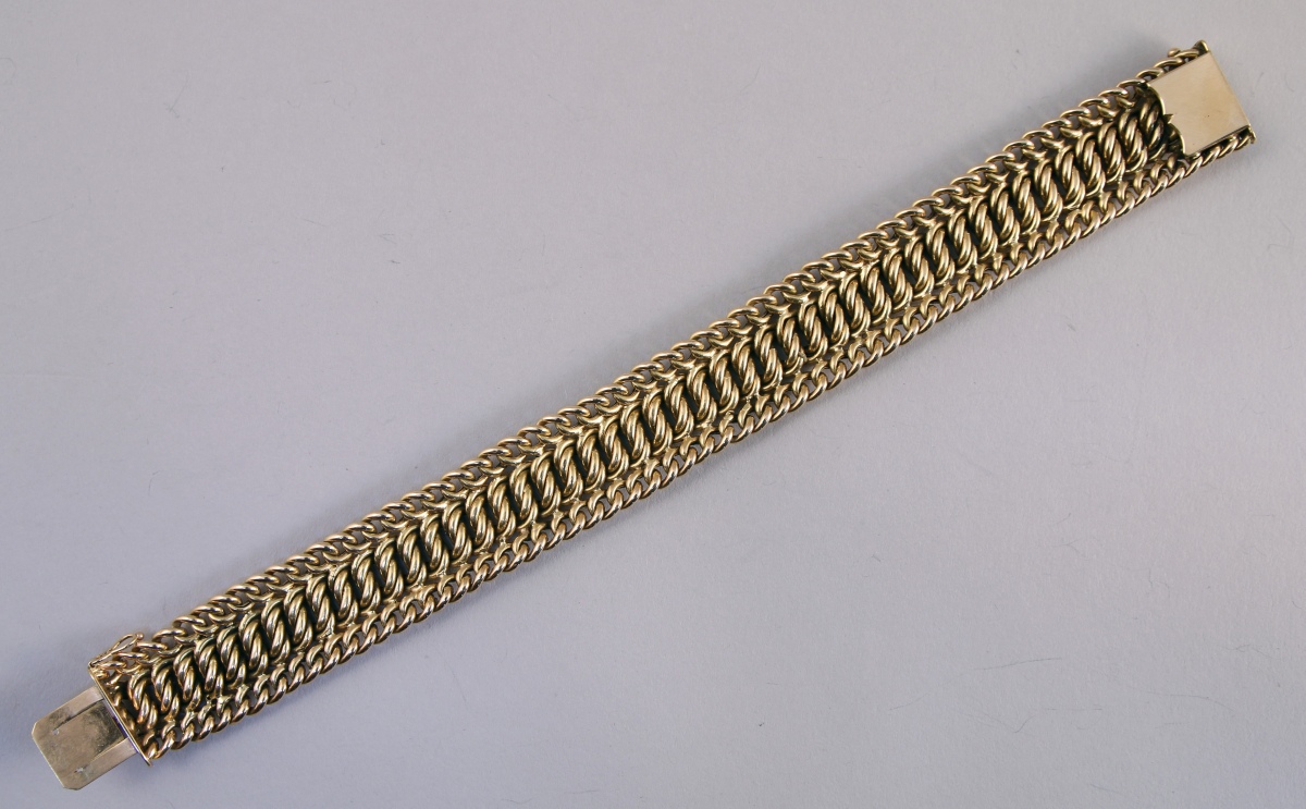 Large BRACELET en or jaune 18K à mailles souples tressés.