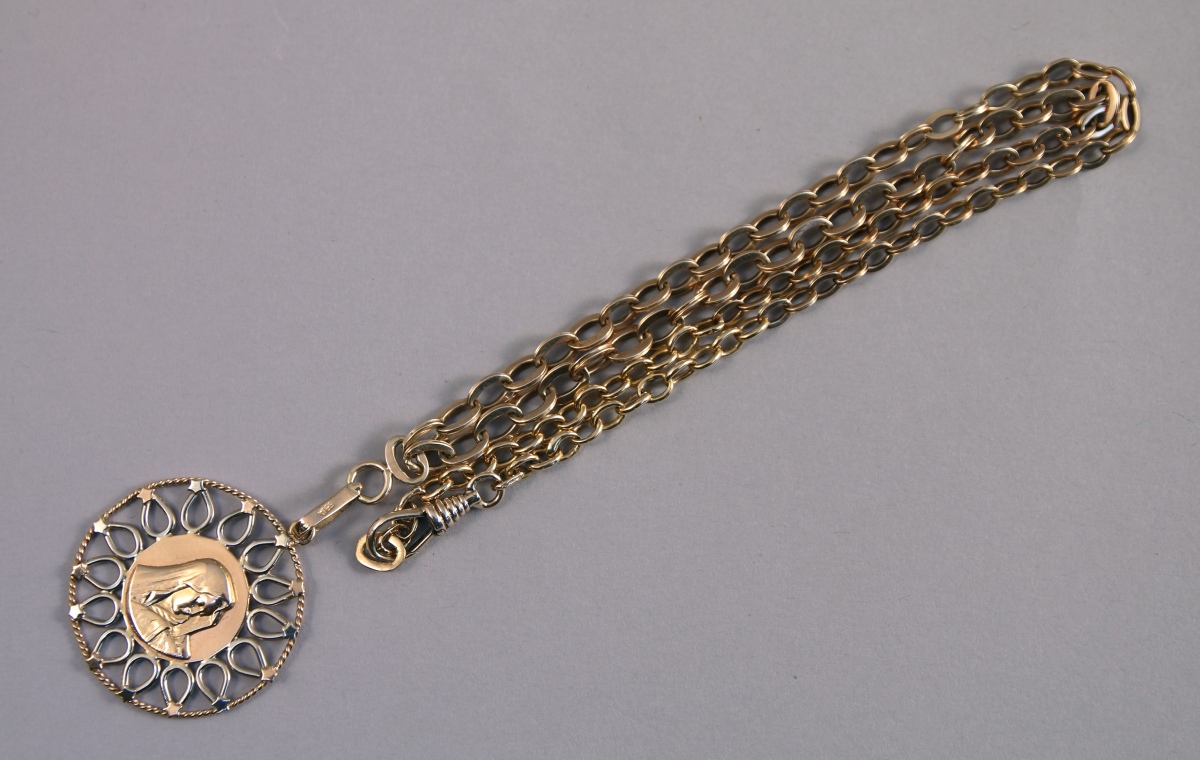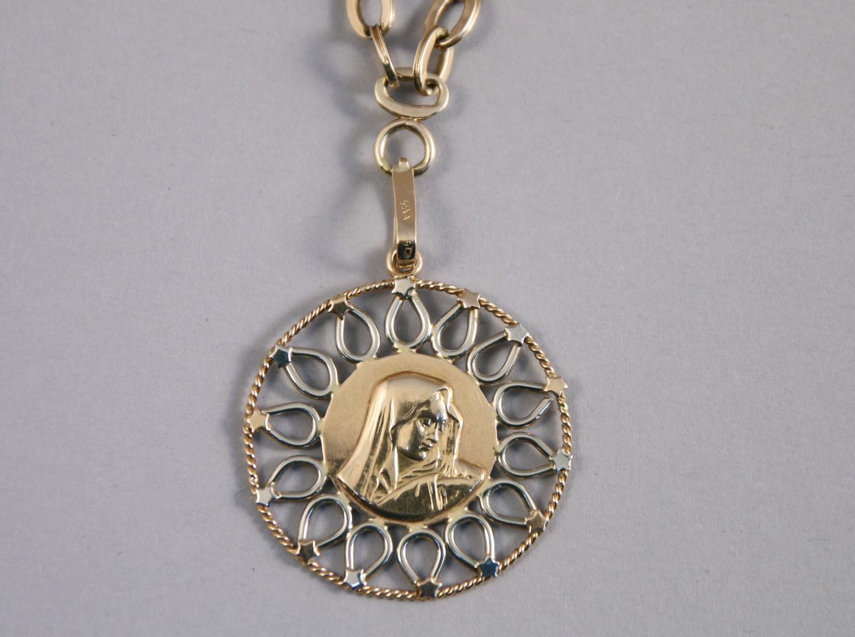 Avec un PENDENTIF centré d'une médaille la sainte Vierge ceinte d'un motif rayonnant étoilé en or jaune et blanc 750 millièmes. Monogrammé superficiellement "TA". Travail étranger. Diam. 3 cm.
