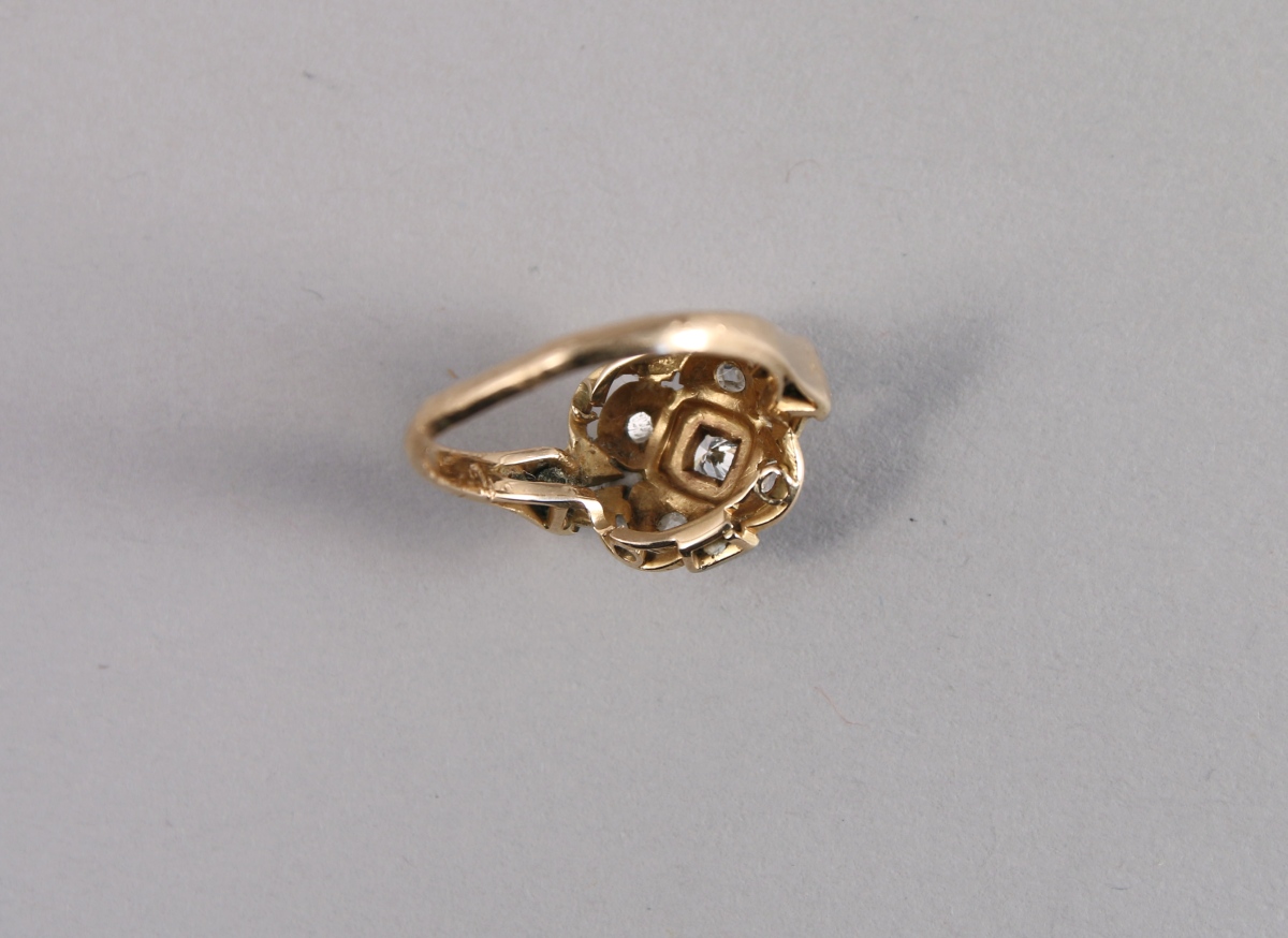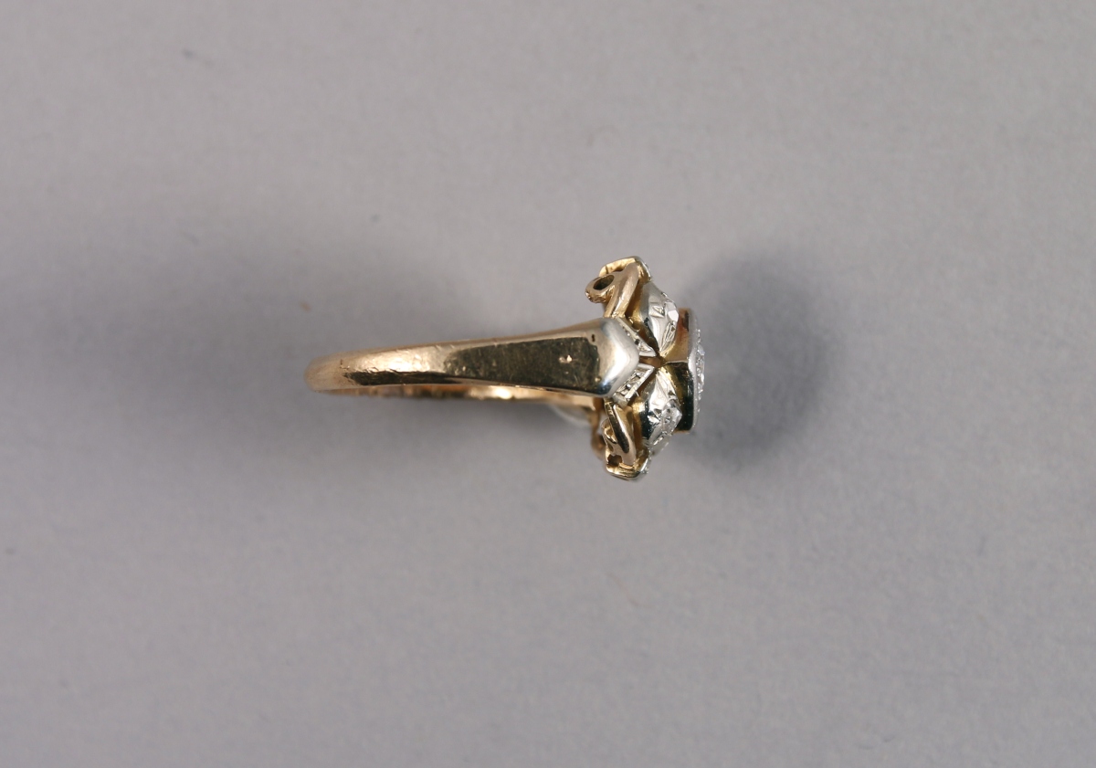 BAGUE en or jaune 18K ornée en son centre d'un DIAMANT demi taille d'environ 0,2 ct (A PRECISER) dans un entourage de quatre petits DIAMANTS dans des lobes.