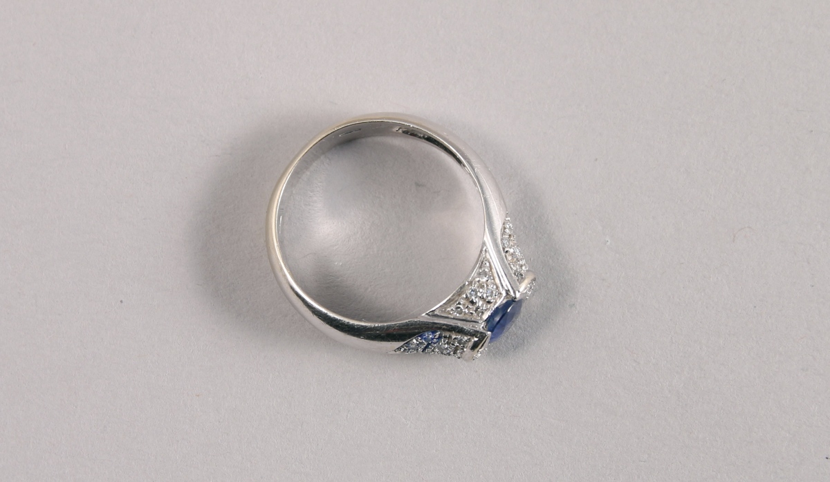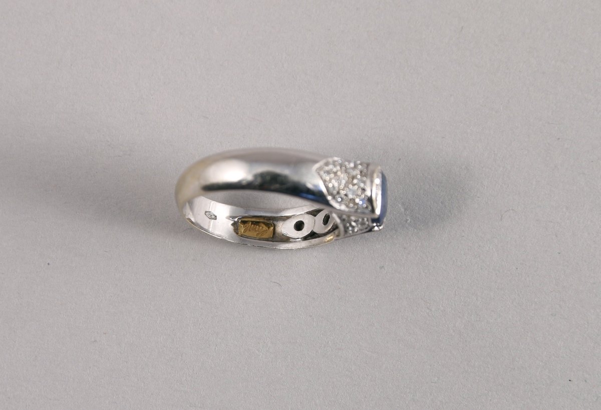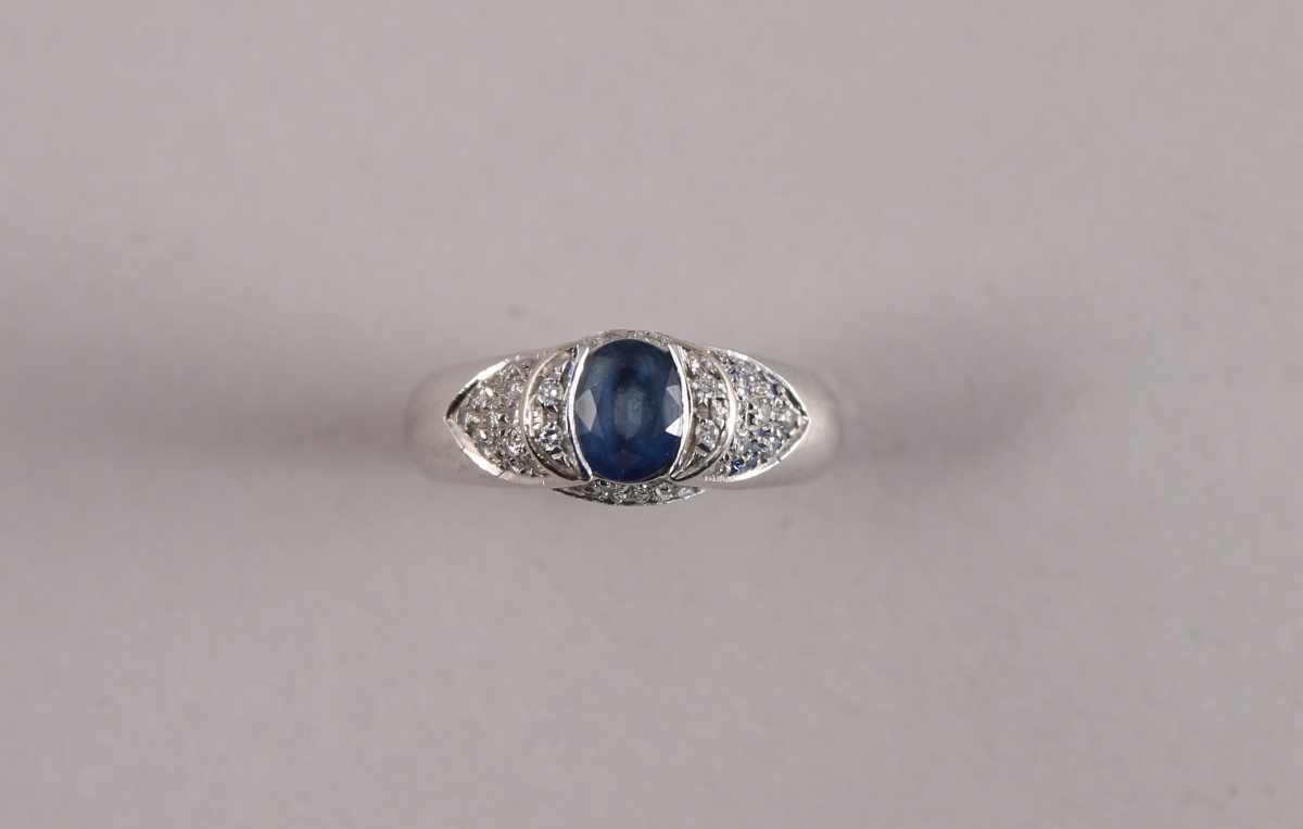 BAGUE en or gris 18K sertie d'un SAPHIR taille ovale. Le chaton et l'épaulement pavés de 36 BRILLANTS.
