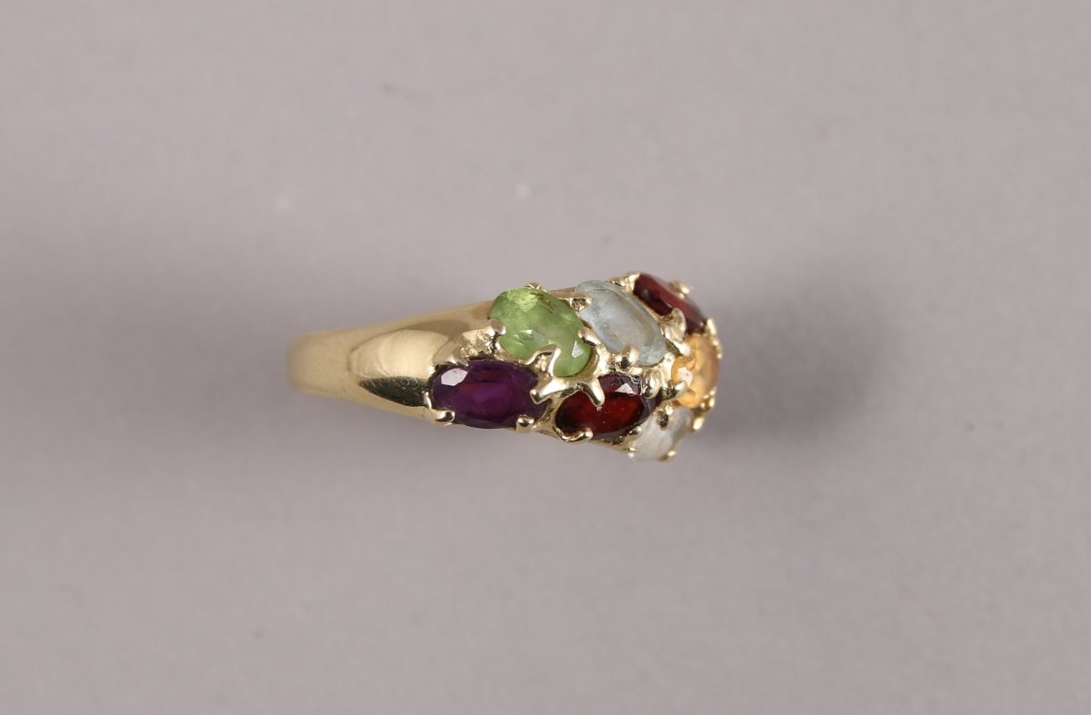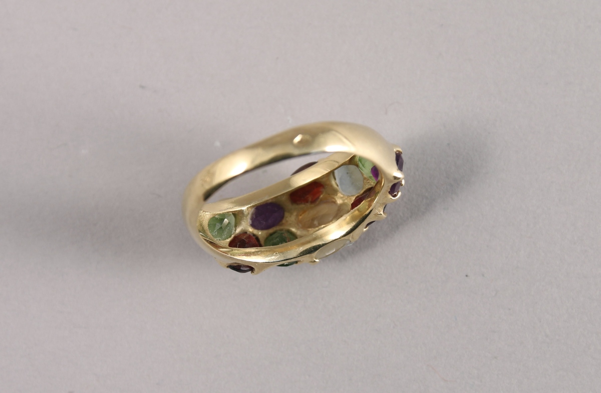 BAGUE dite "TUTTI FRUTI" en or jaune 18K sertie en quinconce de 11 pierres de couleur (vertes, violettes, rouges, jaune et bleues ciel) taille ovale.