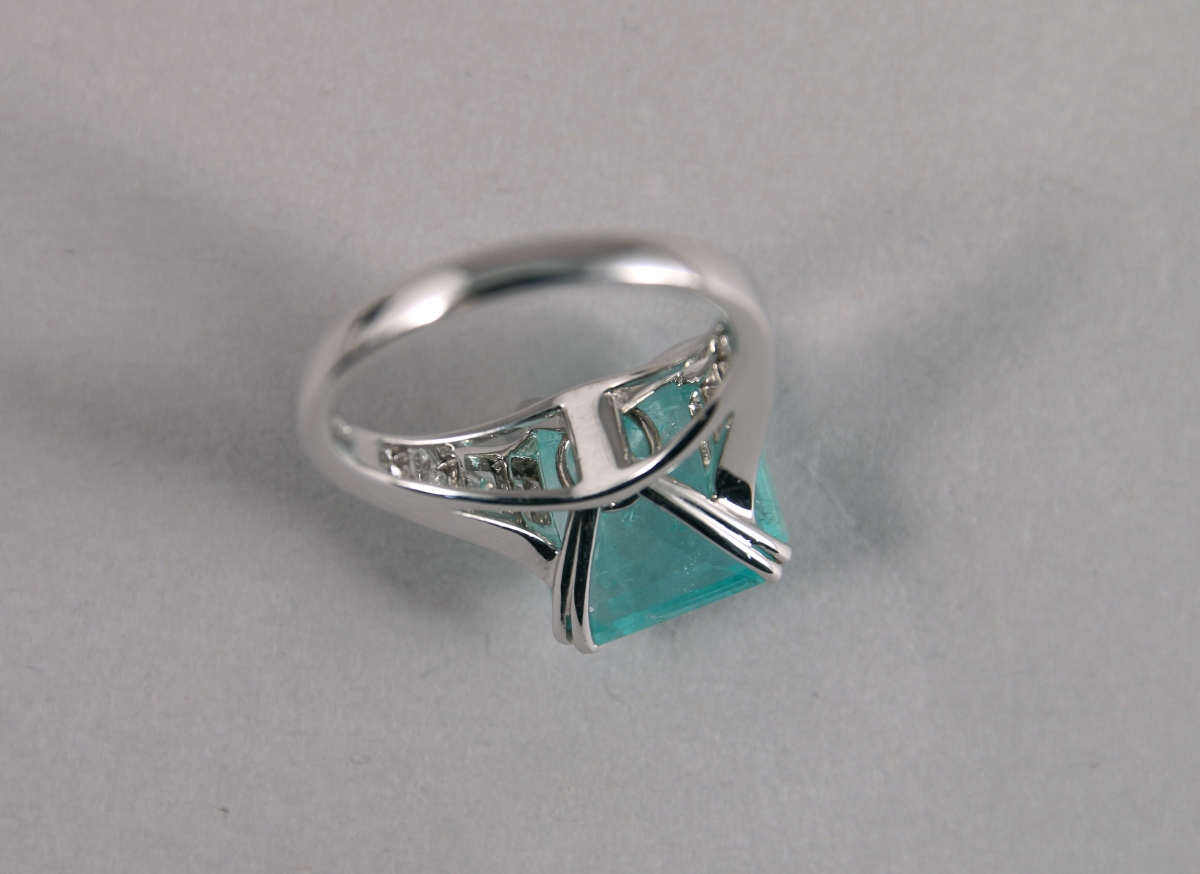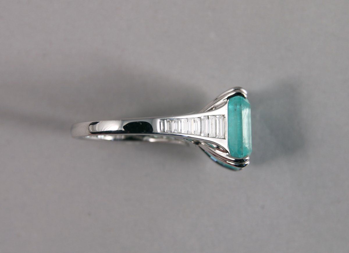 BAGUE en or blanc, sertie d'une ÉMERAUDE (probablement de Colombie) taille émeraude d'environ 7,90 carats, épaulée de 18 DIAMANTS blancs taille baguette en chute d'environ 0,65 carat.