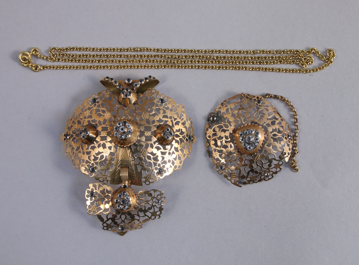 CROIX NORMANDE en or jaune composée de trois éléments finement ajourés de rinceaux et semés de pierres du Rhin (ou strass).