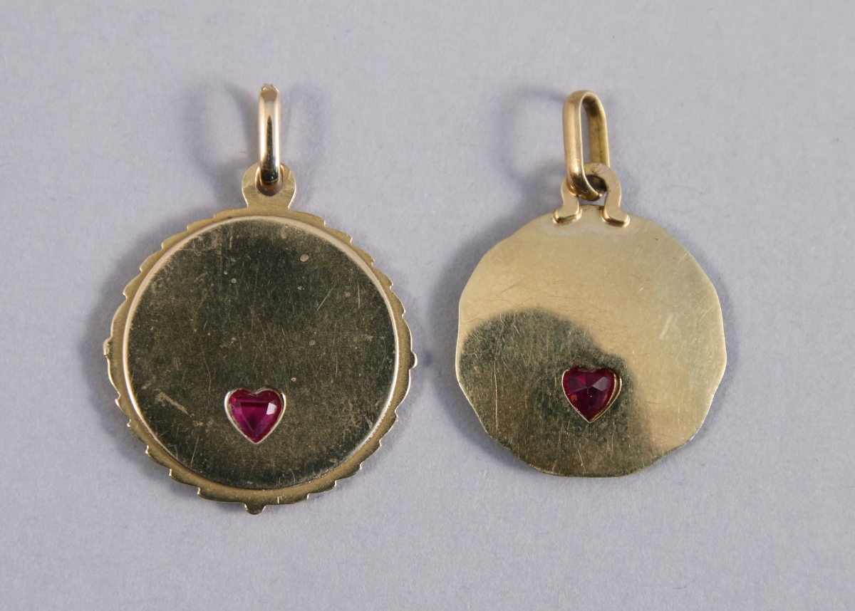 2 MÉDAILLES en or jaune 18K ornées d'une pierre rose taillée en coeur entourée de deux amours avec l'inscription "il bat pour toi".