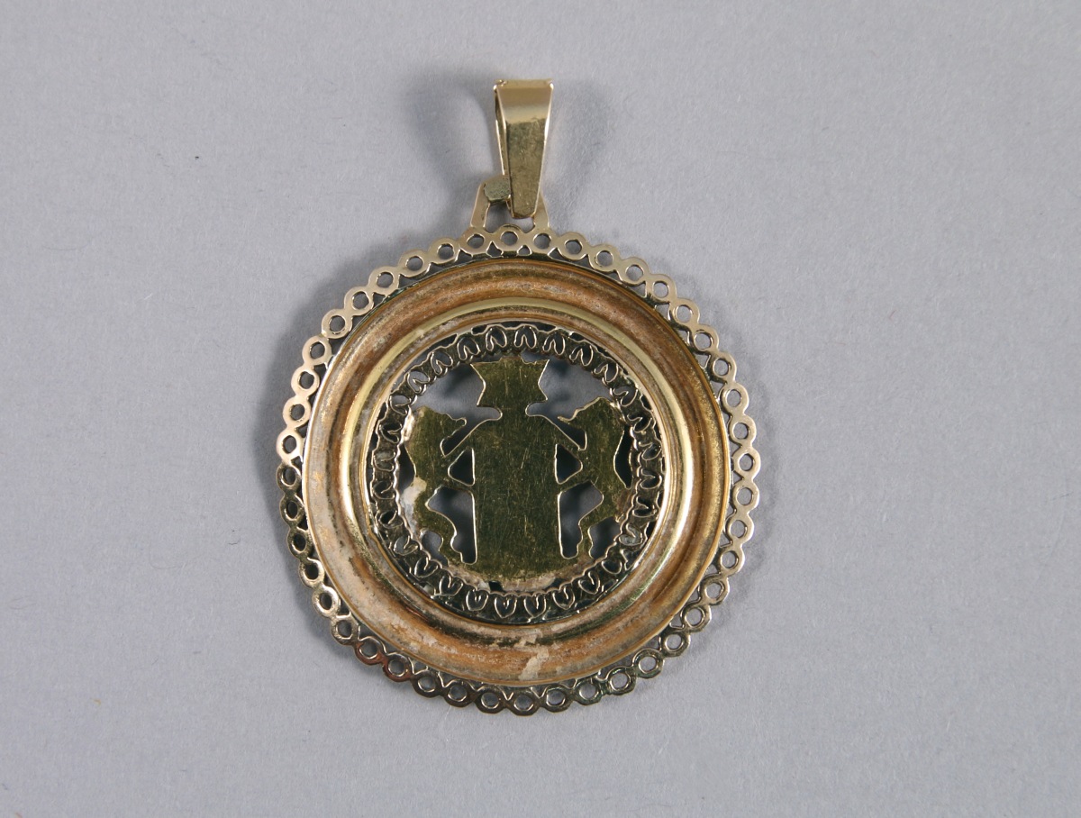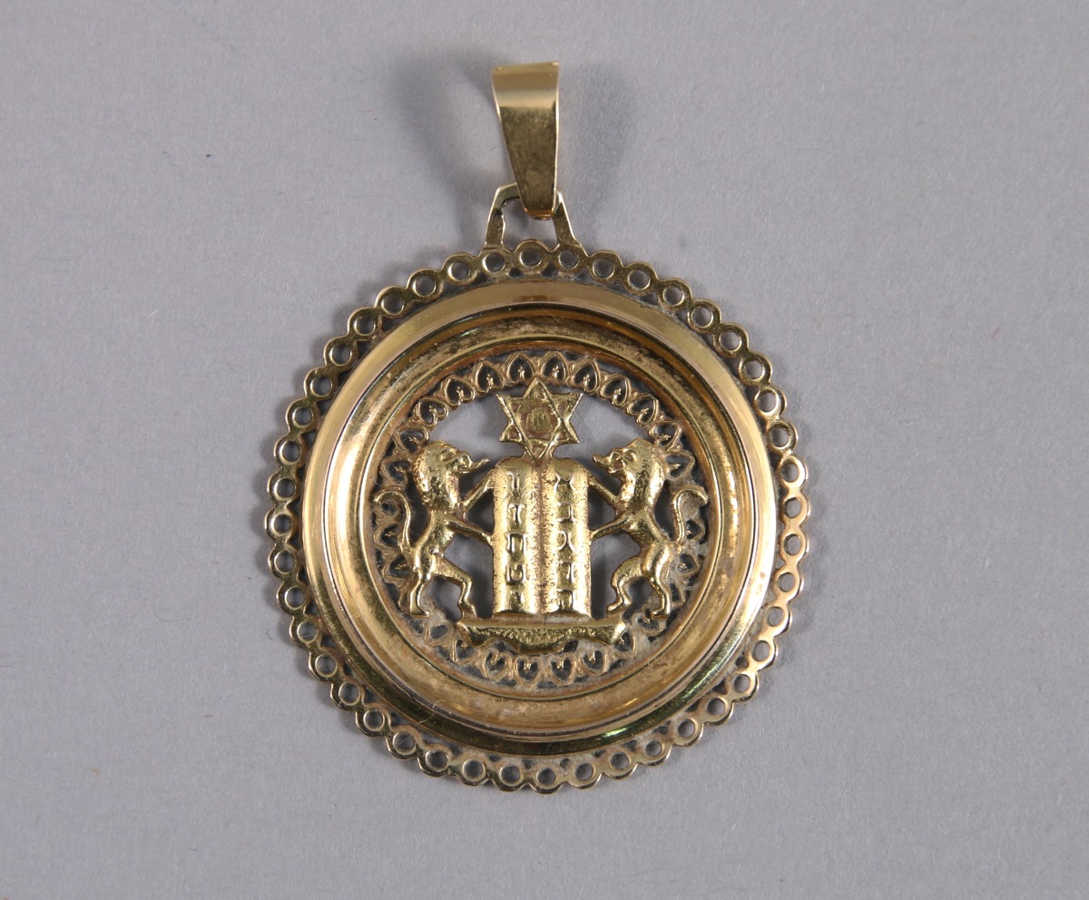 PENDENTIF en or jaune 18K à décor ajouré centré des tables de la Loi soutenues par deux lions et timbrées d'une magen David.