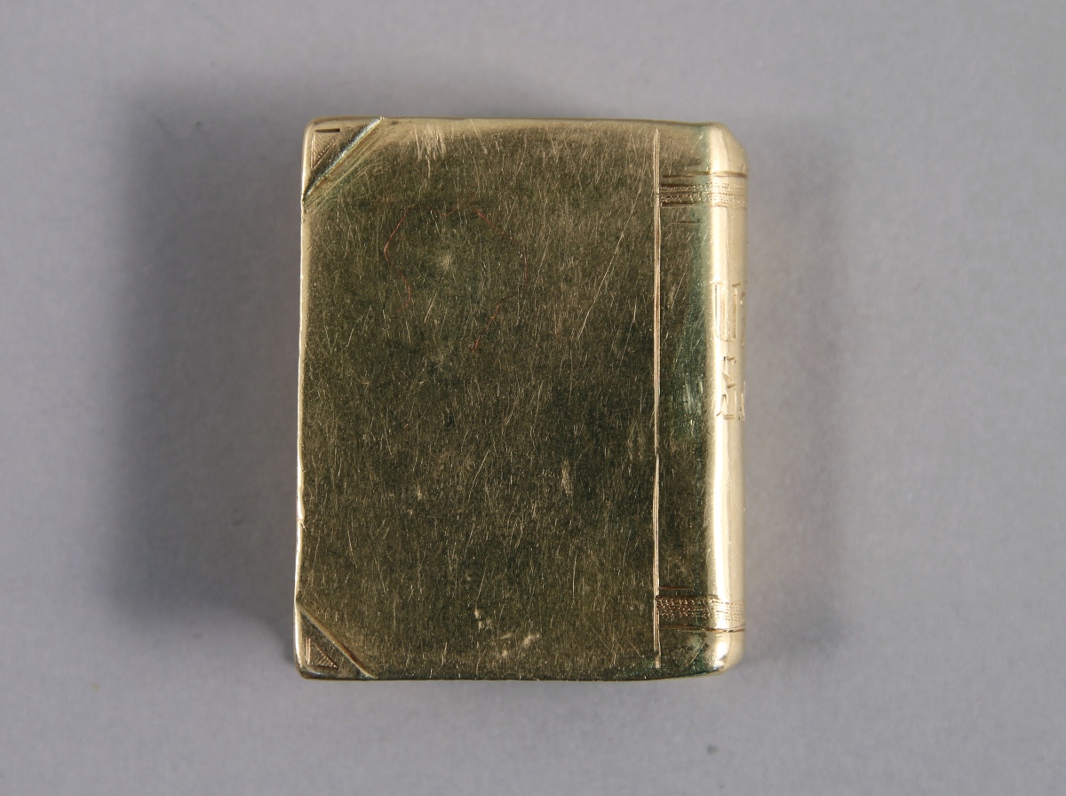 TABATIÈRE en or jaune 14K adoptant la forme d'une Thorah. Le couvercle supérieur à charnière ciselé de rinceaux et centré d'une magen David.