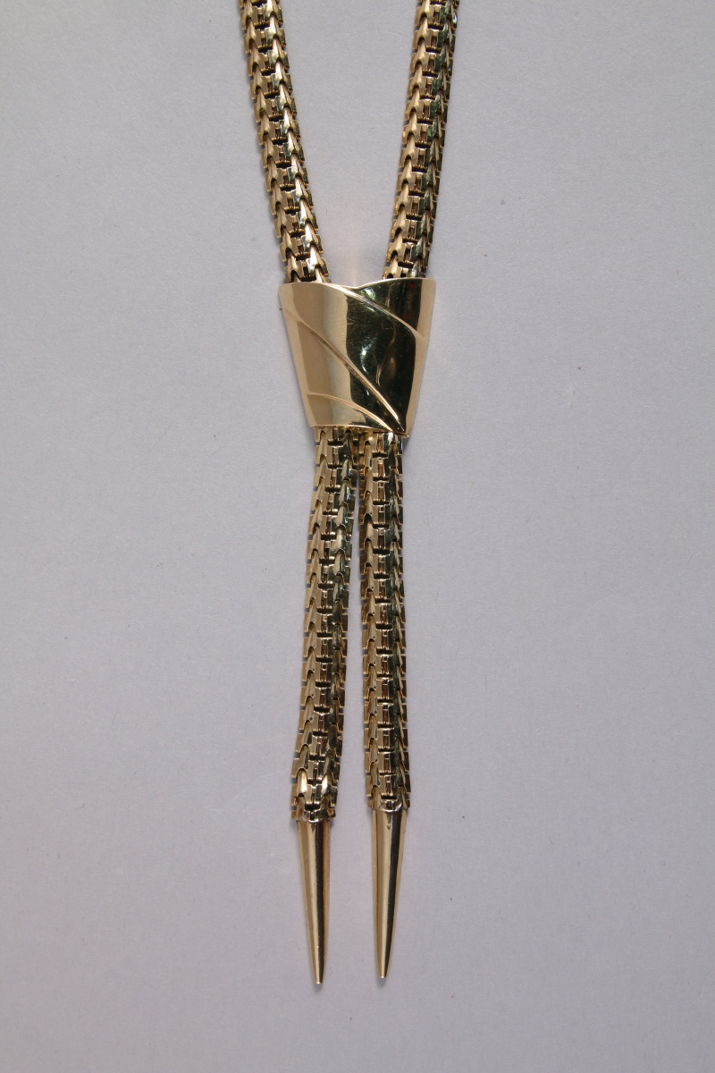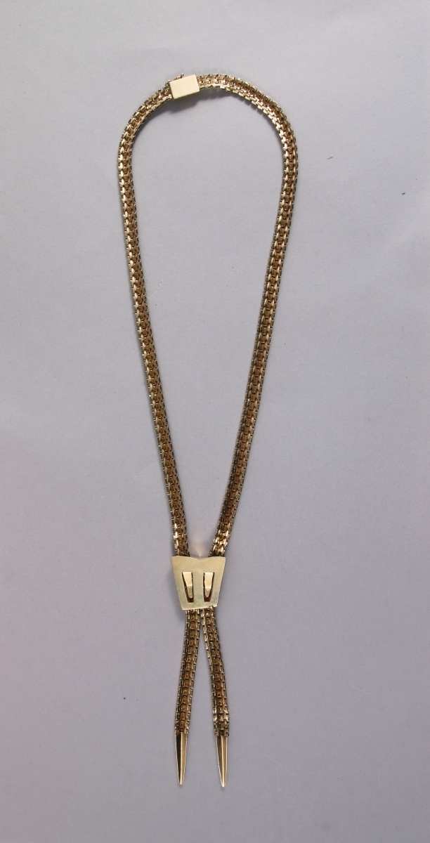 COLLIER en or jaune 18K, maille articulée type serpent. Il se termine par un noeud retenant deux ferrets. Poinçons tête d'aigle et tête de rhinocéros.