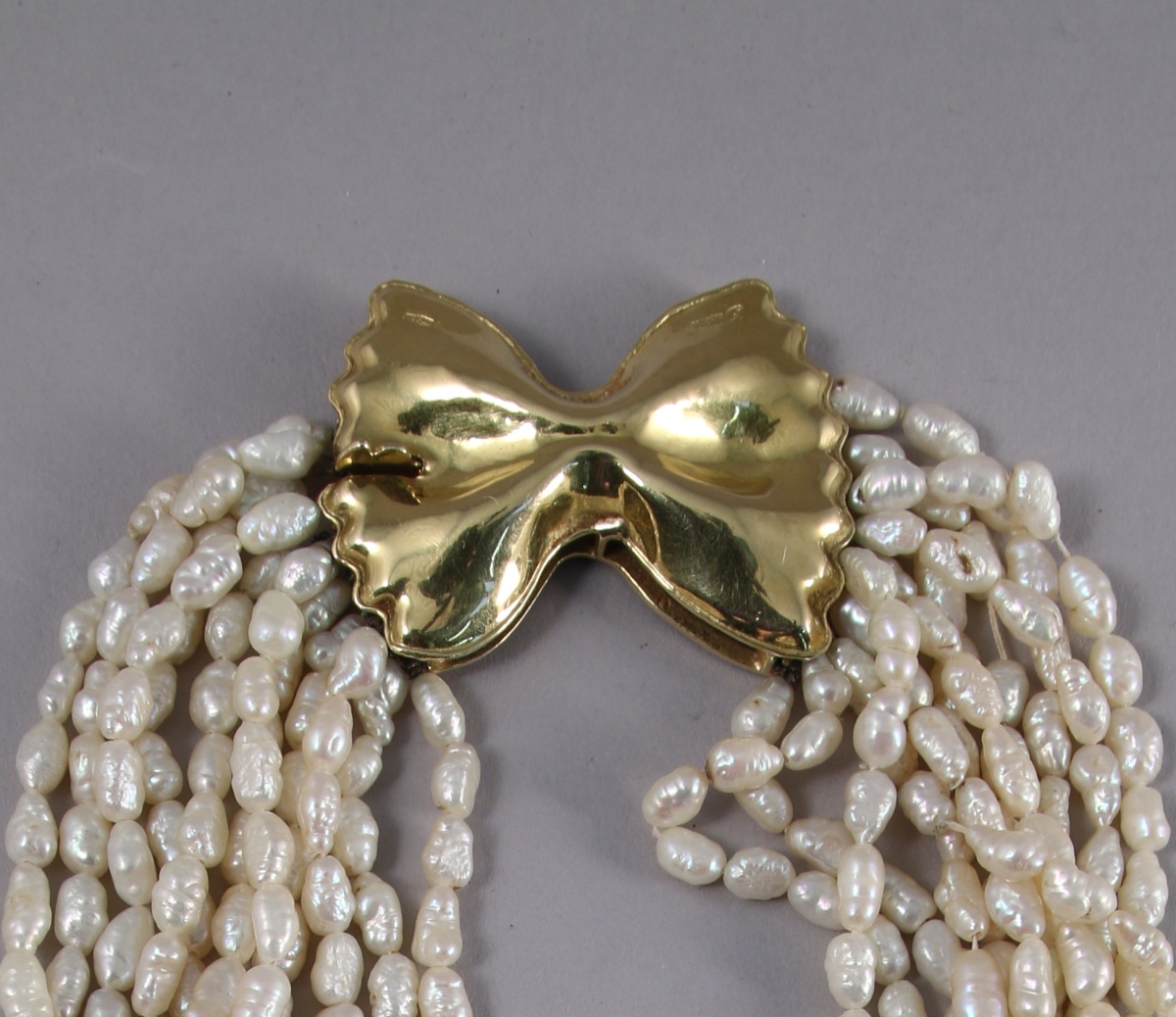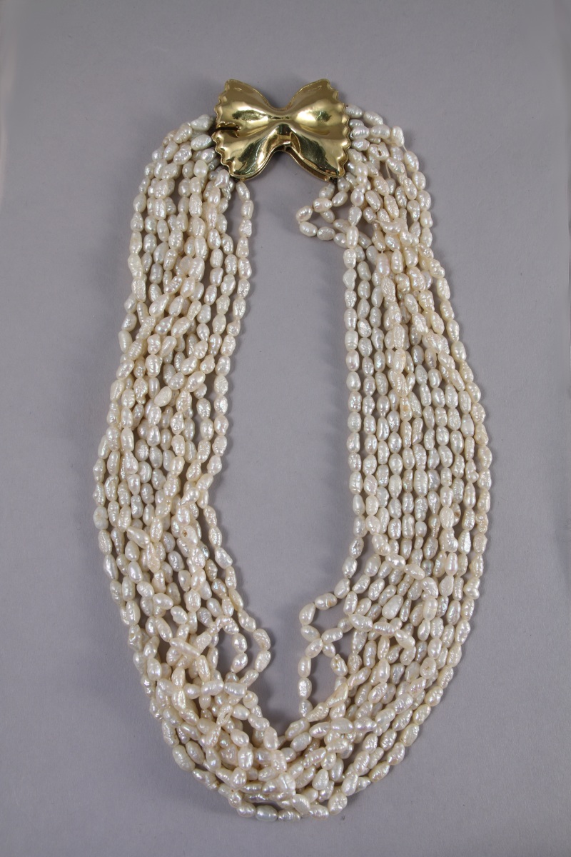 COLLIER à onze rangs de perles keshi, le fermoir en or jaune 750 millièmes figurant un noeud.