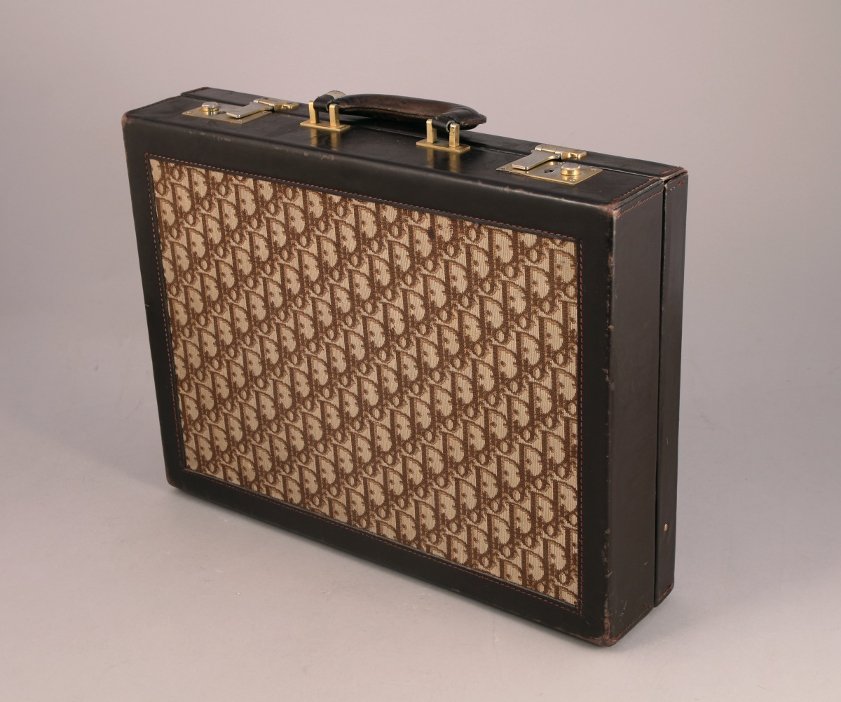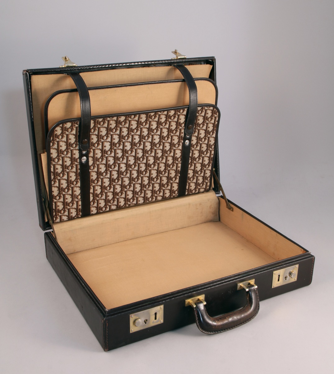DIOR. DEUX BAGAGES en toile monogrammée beige et cuir brun :
