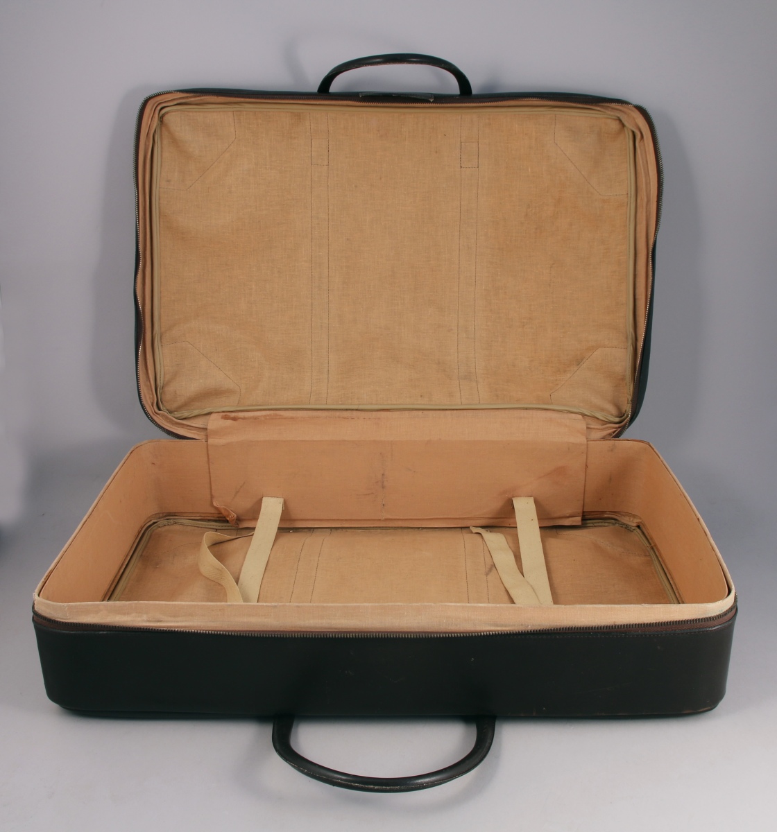 - VALISE à fermeture éclair à double curseur. Fermoir monogrammé plaqué or avec sa clef. Poignée double. Intérieur en toile beige avec étiquette "Made in France".