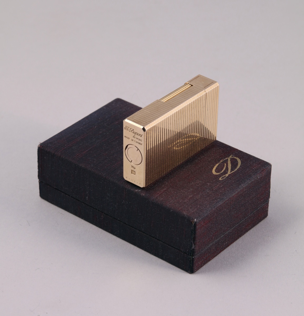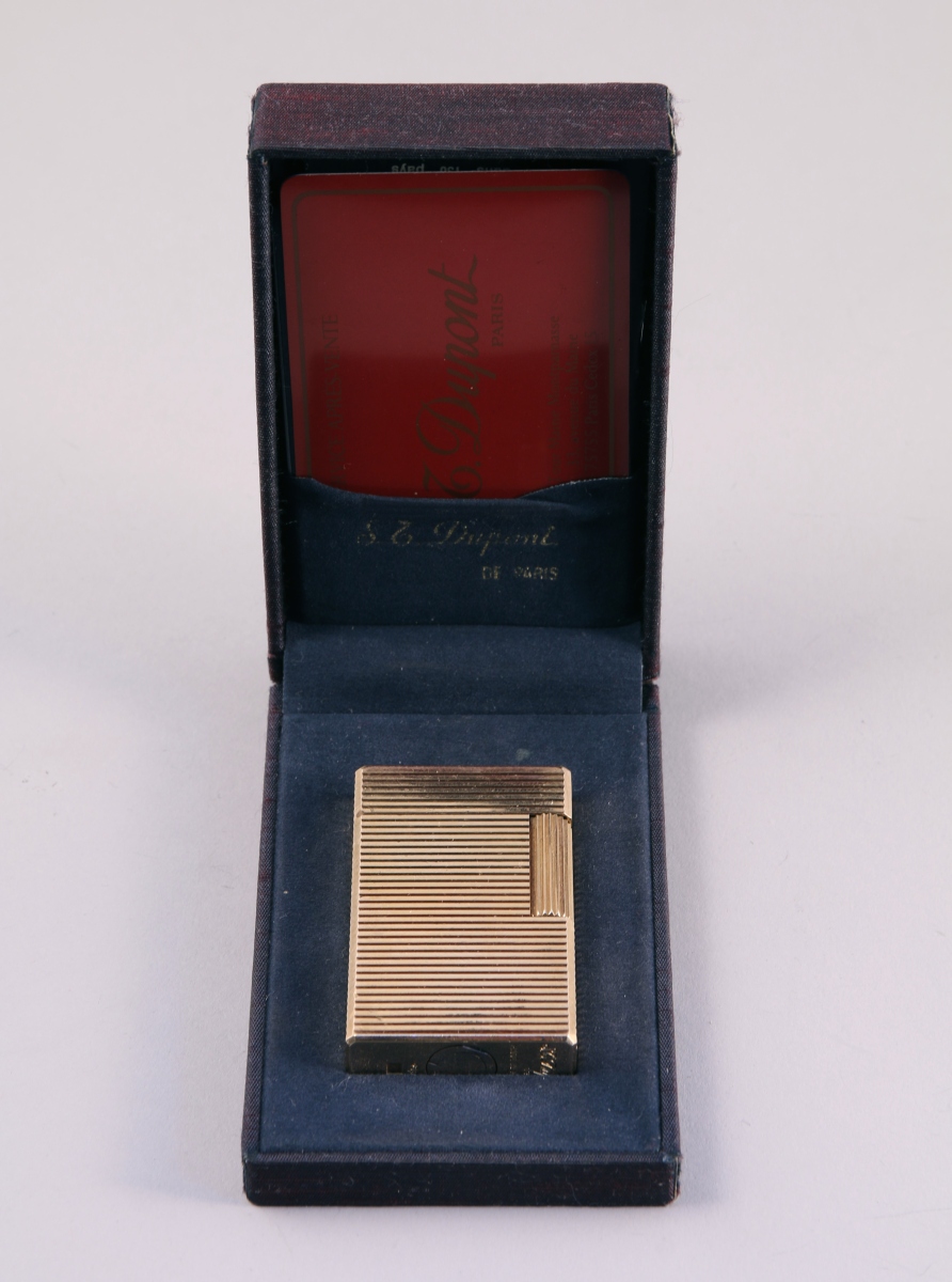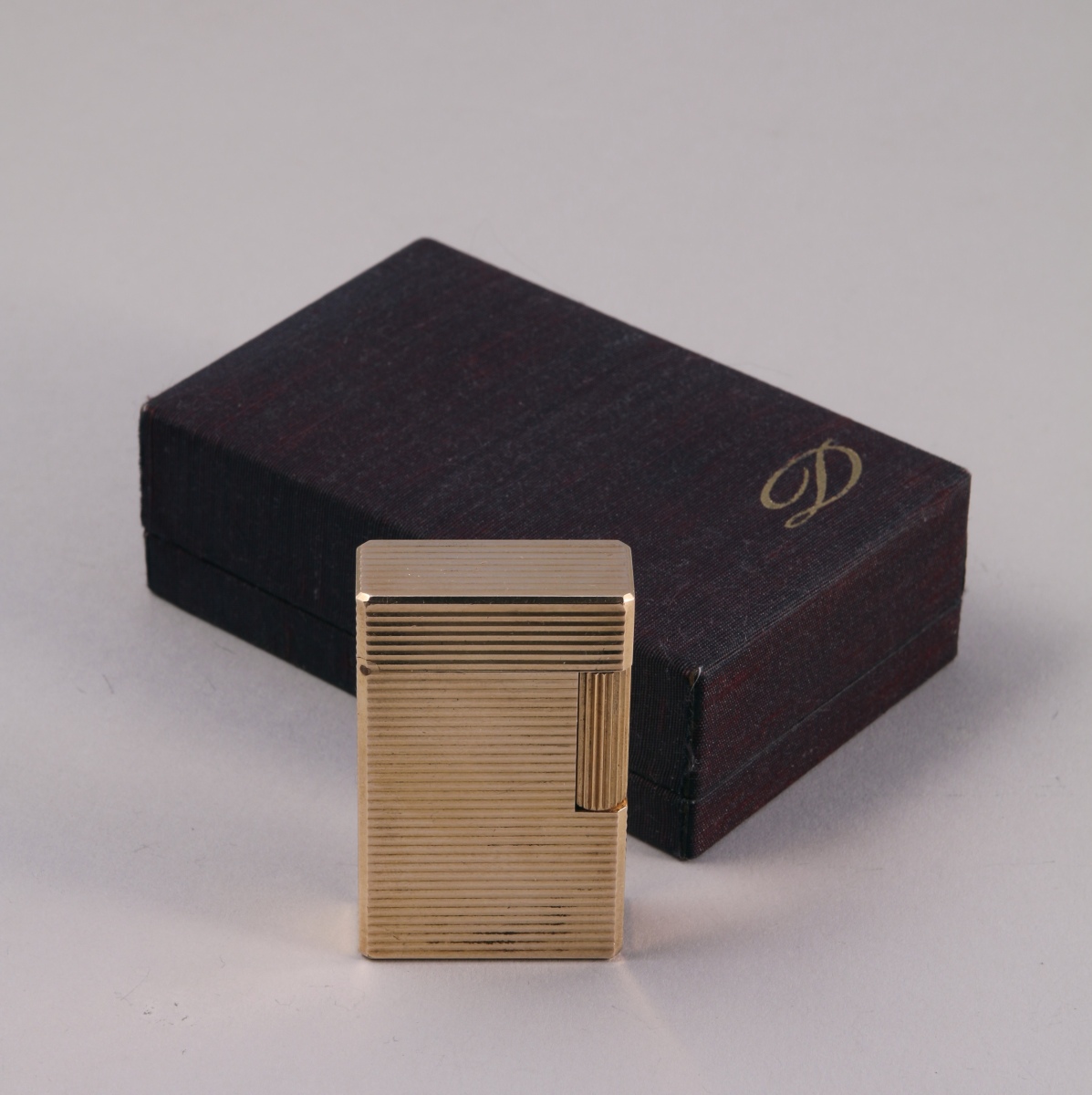 JOINT : DUPONT. BRIQUET de forme rectangulaire en métal doré à décor de cannelures horizontales. Signé et numéroté. Écrin. Haut. 5,8, Larg. 3,5 cm.